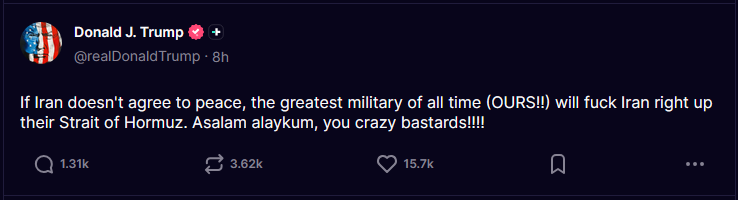 >POTUS: ‘We’re gonna blockade Iran. It will be a total blockade, nothing in or out. It’s going to be very similar to Venezuela. But it will be a higher level.’