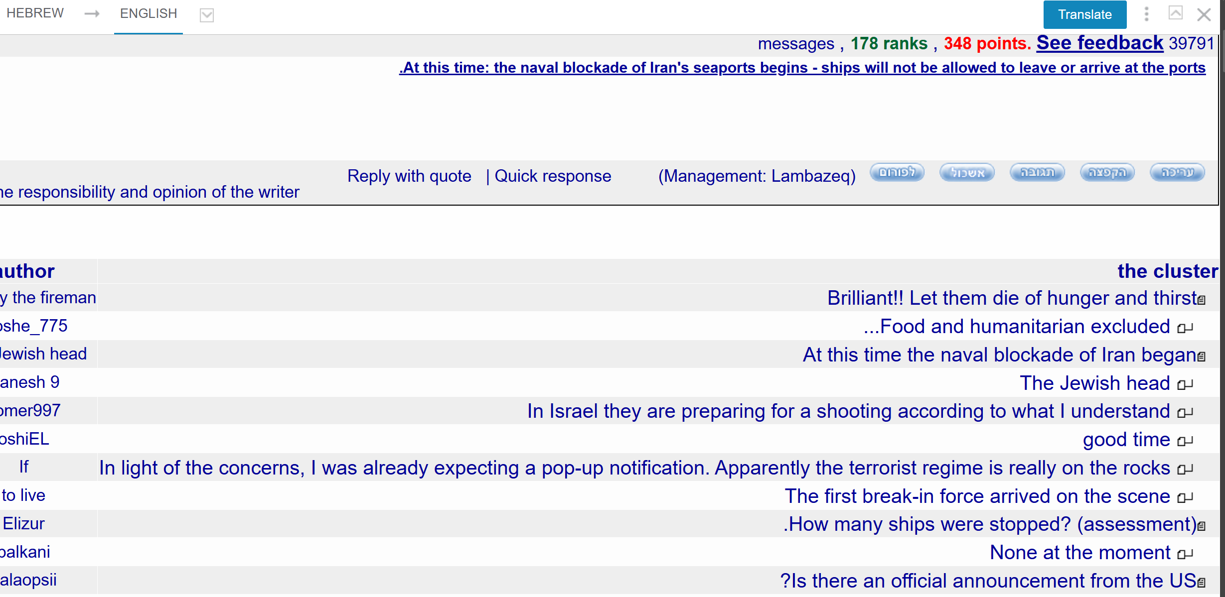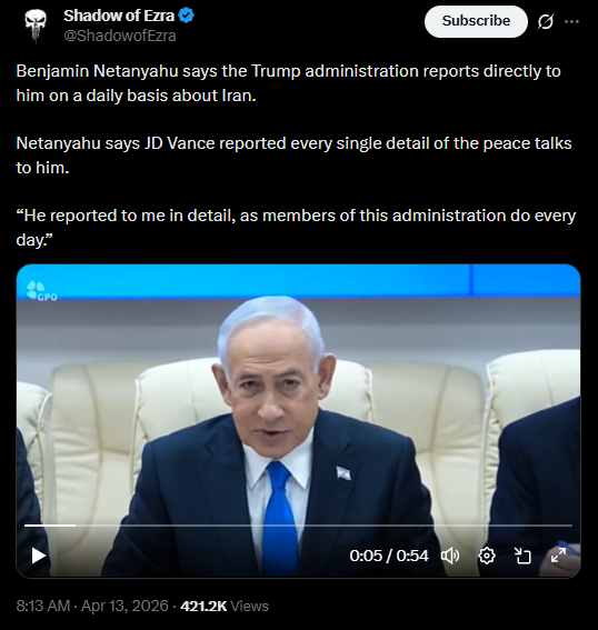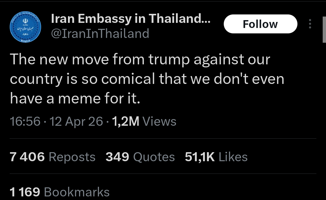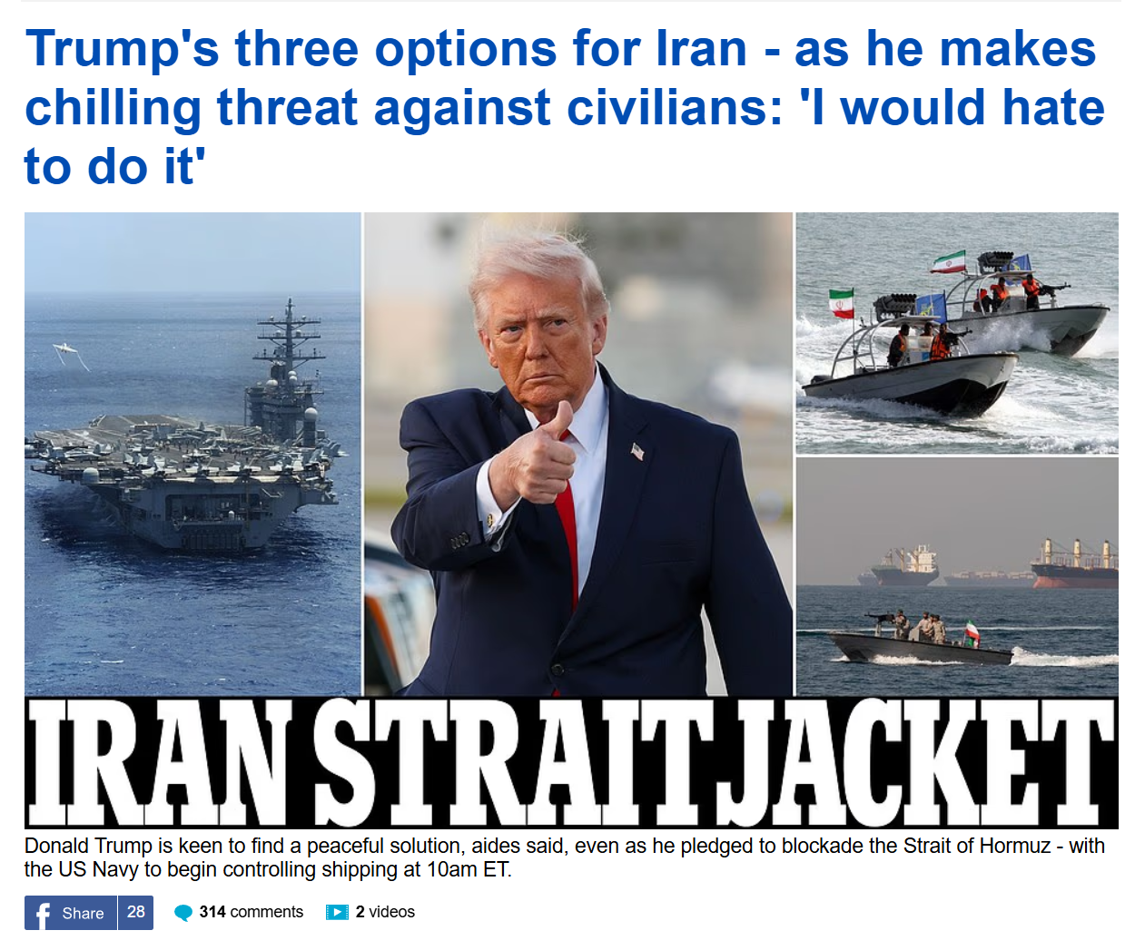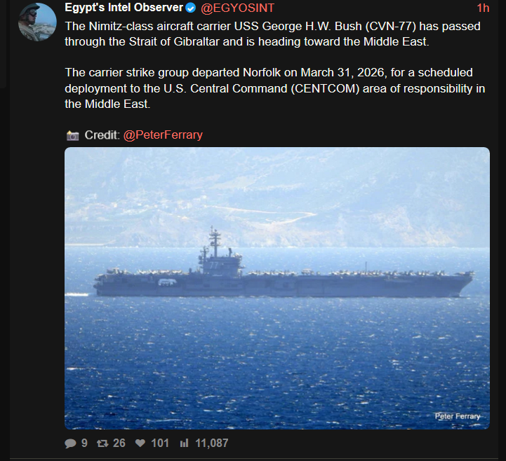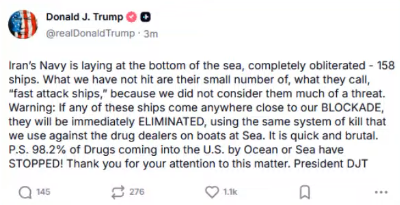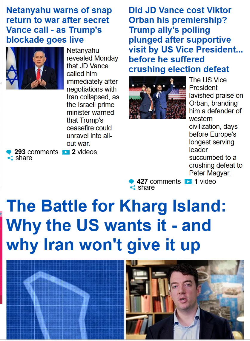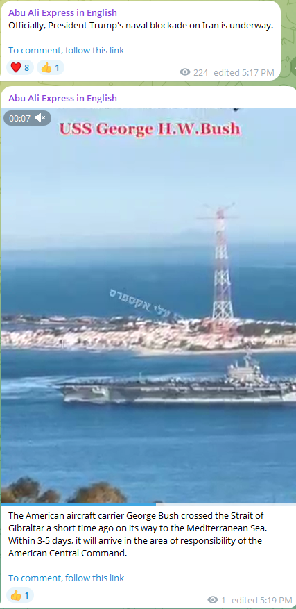 Prev: >>533106338Day: 6 of the 14-day ceasefire™ periodDay: 45 of the Special Military Operation™Trump "We Won" Counter: https://h.uguu.se/gcpsaJbN.txt▶RECENT:>U.S. Central Command announces that the naval blockade against Iran will start tomorrow at 10 AM Eastern Time.>The UK says it will not take part in U.S. blockade of the Strait of Hormuz.>Israel is preparing to renew the war in Iran, with an intent to strike national infrastructure and energy reserves throughout Iran, according to Kan News.>POTUS: ‘I was thinking about calling it the Gulf of Trump, but I decided not to do it.’>POTUS: ‘We’re gonna blockade Iran. It will be a total blockade, nothing in or out. It’s going to be very similar to Venezuela. But it will be a higher level.’>Vance: NO AGREEMENT.>US has agreed to release Iranian frozen assets held in Qatar and other foreign banks, says a senior Iranian source: Reuters.>Iran closes the Strait of Hormuz.▶WARNING:>Do not trust any "happenings" without link/proof>Uкraine / Яussia discussions belong in uнg or cнug>DO NOT ENGAGE WITH DISINGENUOUS (((POSTERS)))▶Thread Theme:https://www.youtube.com/watch?v=UNAr5tzZxdk▶Oil:>https://oilprice.com/oil-price-charts/▶Kino:https://files.catbox.moe/fx86zj.mp4https://files.catbox.moe/cbd7ug.mp4https://files.catbox.moe/2hwzcx.mp4https://files.catbox.moe/smmsfw.mp4https://files.catbox.moe/x0fbgv.mp4https://files.catbox.moe/20lpu8.mp4https://files.catbox.moe/86yxn2.mp4▶Live-streams:https://www.youtube.com/watch?v=4E-iFtUM2kk https://www.youtube.com/watch?v=TdcrT5OcS9c https://www.youtube.com/watch?v=53G-Oy4r6M4 ▶Telegram Channelshttps://rentry.org/tgnews▶Israel Rocket Alertshttps://www.tzevaadom.co.il/en/▶Air Traffichttps://www.flightradar24.com/https://flightaware.com/livehttps://globe.adsbexchange.com/▶Maritime Traffichttps://www.marinetraffic.com/https://www.vesselfinder.com/