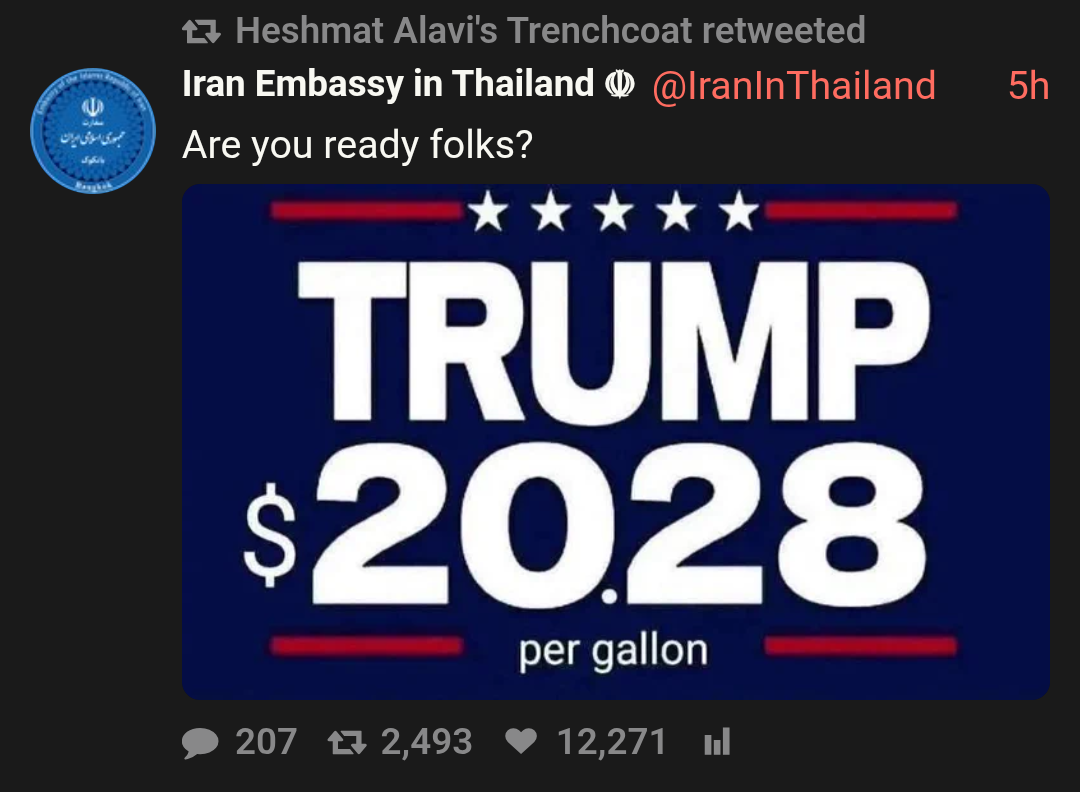 Meanwhile the house of cards known as the US economy will collapse. The AI bubble is just waiting to burst. Any economic downturn will do it, but an economic downturn as a result of increased energy prices will only make it crash harder since AI uses so much goddamn energy to produce nothing of any immediate monetary value.
