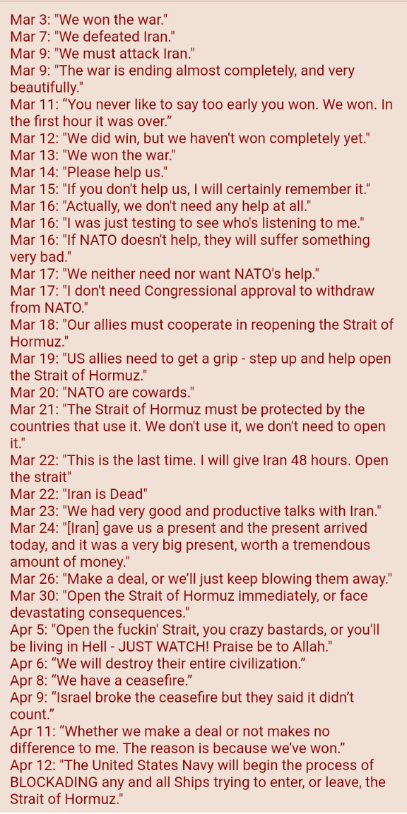 >blockading a strait 1 month after claiming it will open by itself