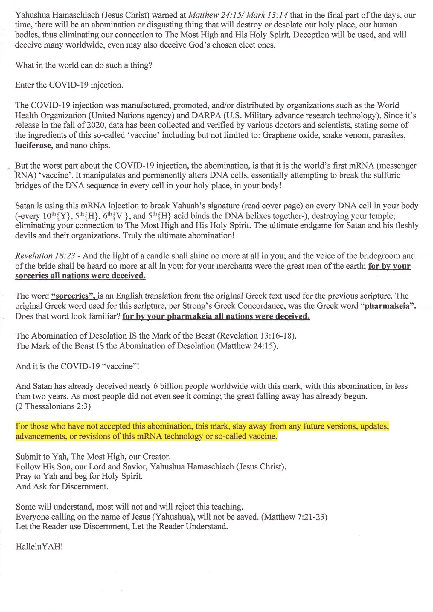 >>533121252The covid vaccine is the mark of the beast and Trump called himself "The Father of the vaccine"Operation: Warp SpeedWar on Seed (Genesis & Revelation)mRNA alters the image of God (DNA)