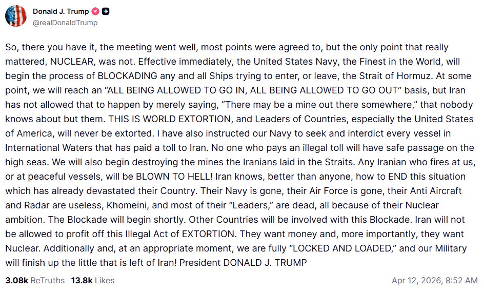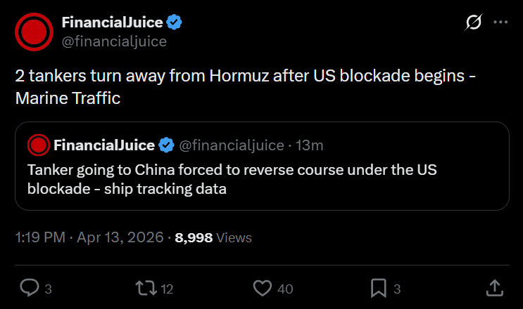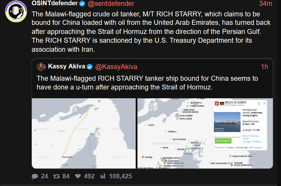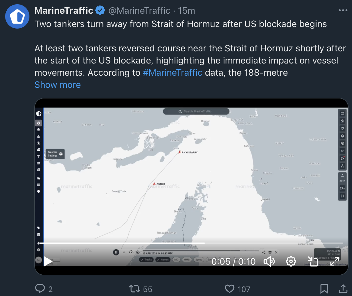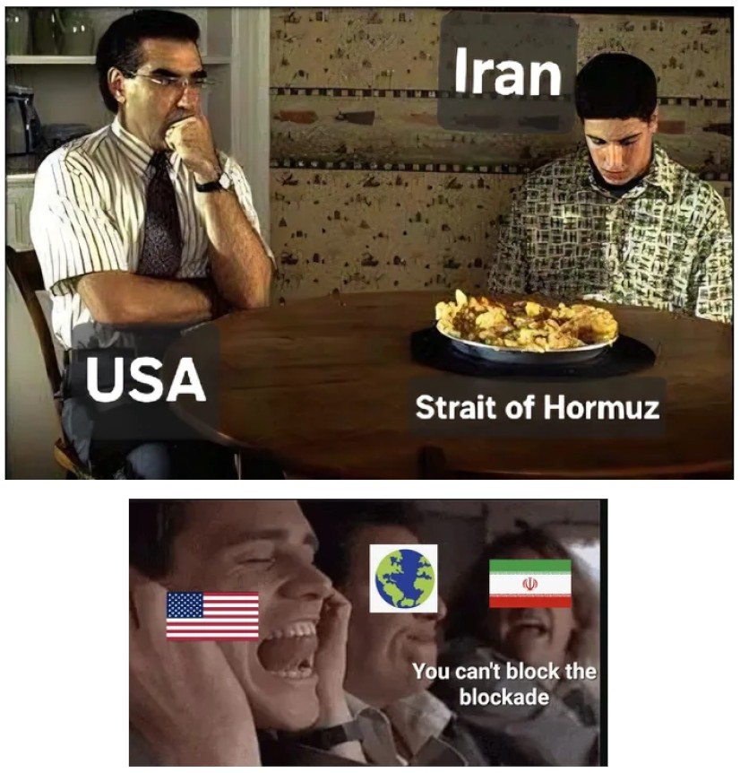 Previous: >>533119094Day: 6 of the 14-day ceasefire™ periodDay: 45 of the Special Military Operation™▶RECENT:>Lebanon death toll: 2,089, wounded: 6.762 from Israeli attacks since March 2>UN: a diplomatic push is underway to ensure safe passage for fertiliser shipments>UK's Starmer with France's Macron to convene summit to address the Strait of Hormuz situation this week. Will focus on reaching a diplomatic solution to end conflict and military planning to “provide assurance to shipping as soon as a stable environment can be established">China’s 48th Task Force (including destroyer Tangshan) is in the region. Their presence serves as a "shield" for tankers; any accidental strike by US forces on a Chinese vessel could escalate the conflict into a global superpower confrontation>CENTCOM: Vessels to be subject to interception, diversion and capture. Will not impede neutral transit passage to or from non-Iranian destinations>US blockade of the Strait of Hormuz has officially gone into effect▶WARNING:>Do not trust any "happenings" without link/proof>Uкraine / Яussia discussions belong in uнg or cнug>VERIFY BEFORE CLICKING LINKS IN POSTS OR OP. LINKS MAY BE IP GRABBERS OR MALWARE▶Oil:>https://oilprice.com/oil-price-charts▶Kino:https://files.catbox.moe/fx86zj.mp4https://files.catbox.moe/cbd7ug.mp4https://files.catbox.moe/2hwzcx.mp4https://files.catbox.moe/smmsfw.mp4https://files.catbox.moe/x0fbgv.mp4https://files.catbox.moe/20lpu8.mp4https://files.catbox.moe/86yxn2.mp4▶Live-streams:https://www.youtube.com/watch?v=4E-iFtUM2kkhttps://www.youtube.com/watch?v=TdcrT5OcS9chttps://www.youtube.com/watch?v=53G-Oy4r6M4▶Telegram Channelshttps://rentry.org/tgnews▶Israel Rocket Alertshttps://www.tzevaadom.co.il/en▶Air Traffichttps://www.flightradar24.com/https://flightaware.com/livehttps://globe.adsbexchange.com/▶Maritime Traffichttps://www.marinetraffic.comhttps://www.vesselfinder.com