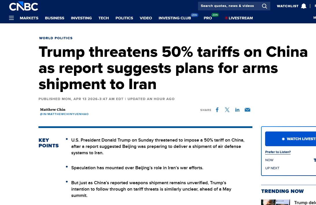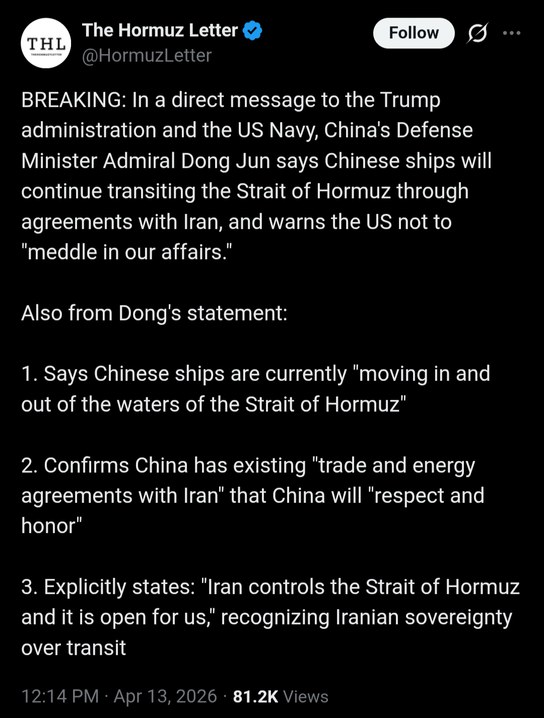 the Hormuz Letter claims there is a BREAKING message from China to the USN saying it will disregard the blockade.is this real? I can't find another source