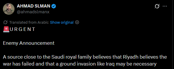 >>533124417I saw a line of reasoning that goes like: Saudi planners didn't want a war, but now that it's happening anyway, they want Iran to be defeated.Their #1 preference was no war, but that is impossible now, so their #2 preference is Iranian defeat and they have to go all-in to achieve that.The only alternative is essentially Iranian victory where they become a regional power, and that's not acceptable to the GCC whose existence has depended on foreign great power domination since at least the days of the Ottomans. One-sided conflict between the US and whichever state they're bombing this week is bad enough. Two-sided conflict between regional powers means a disastrous turn of events, a return to actual mass-mobilization wars without great powers to tip the scale and quiet things down. If the US lacks the ability then there's no second option. Russia is no longer a great power, Europe lacks both the will and ability, China has no interest in foreign intervention. It means a warring states period for the middle east, a multipolar region that will fight many long, deadly wars for hegemony without a clear end in sight.