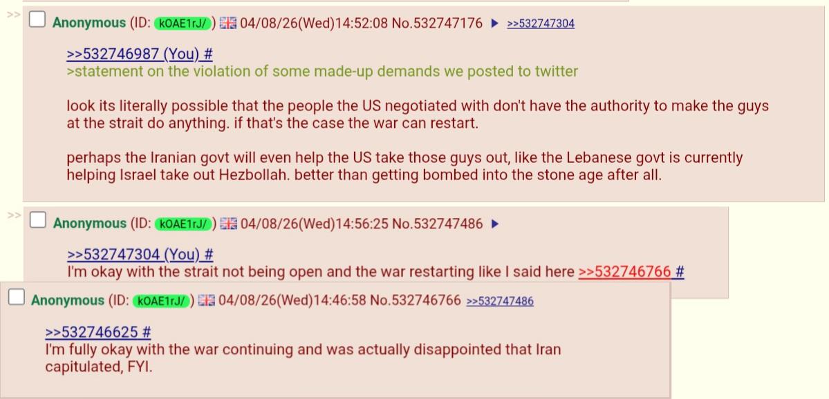 >>533125503It's not possible for the Saudis under any circumstances, but they can at least believe it's possible for the United States, and push them to try it. And if they're wrong, well then they did the best they could, right? It's the Americans that will be losing money and materiel and lives anyway, not them. This is the mindset of every party to this conflict except Iran I think. Encourage the Americans, let them try and kill Iran. If they fail, at least Iran was beaten up and we didn't risk anything, if the strait was going to be closed anyway there was nothing more we could do. And if they succeed, then we were on their side all along and deserve rewards.