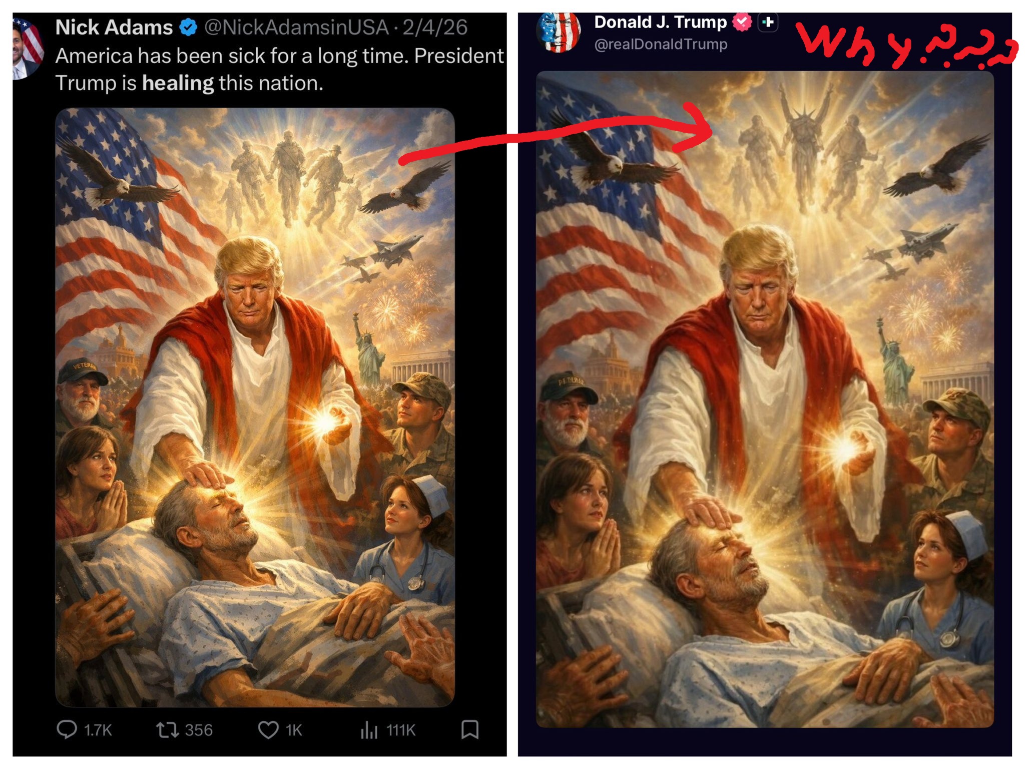 >>533125226It’s true though. Nobody actually is offended by this. The only people making a stink are people who didn’t like him to begin with. There’s nothing about that image that makes him look like Jesus. That’s just idiots pulling at straws. There have been many healers through history, including doctors. Remember, these people want boys on girls sports teams, they’re not right in the head. .