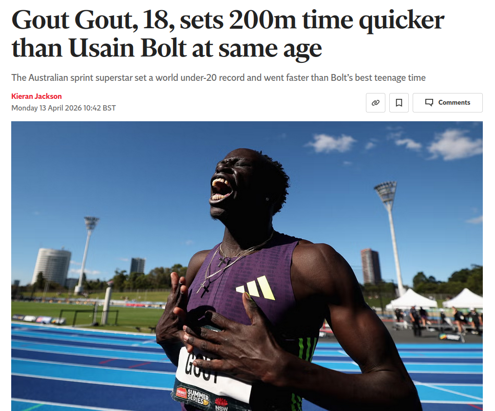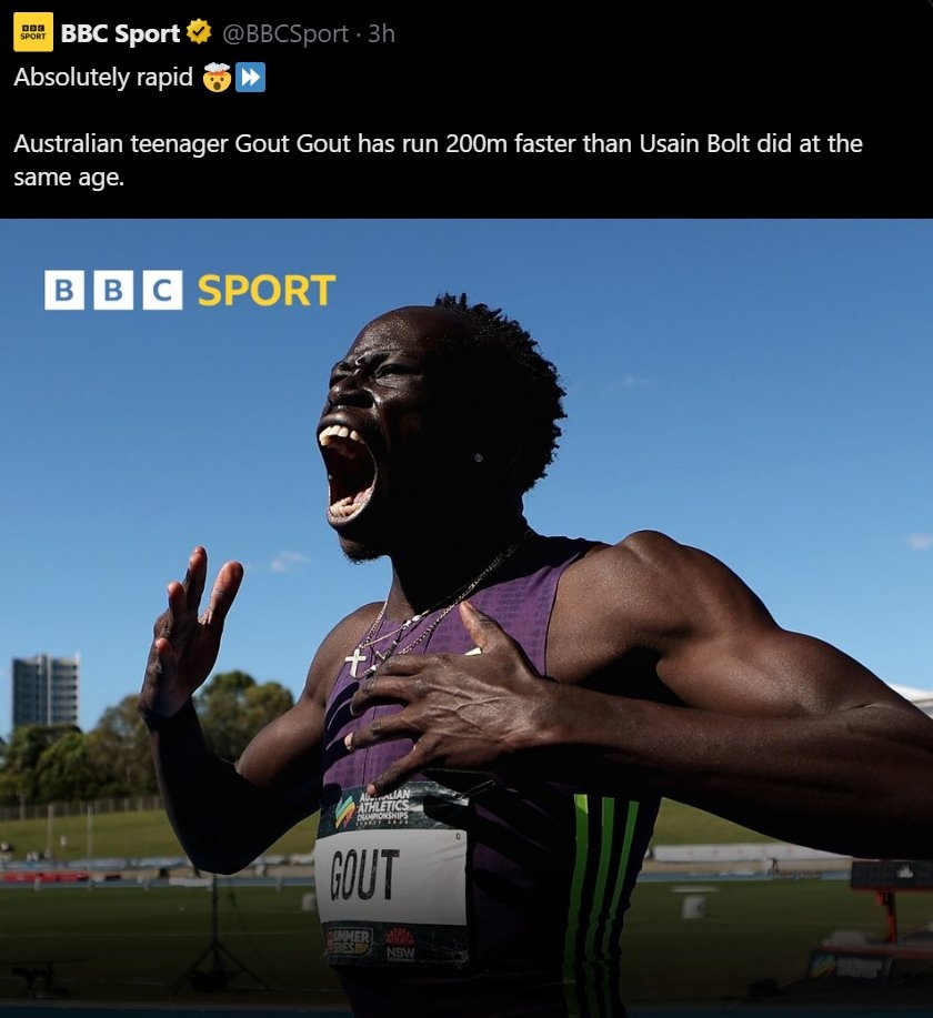 >>533126577White guy just set the U20 mile record like a year ago. Another White guy set the U18 mile record a few months ago. A White woman just set the U20 5k record less than a year ago. Stop trolling. Gout Gout didn't beat Bolt's 200m world record -- he beat Bolt's U20 (under age 20) record. This isn't as impressive as it sounds, considering Bolt got into sprinting relatively late as a teen. Beating Bolt's U20 times doesn't mean you're ever going to come close to the Olympic world records he set later in life.