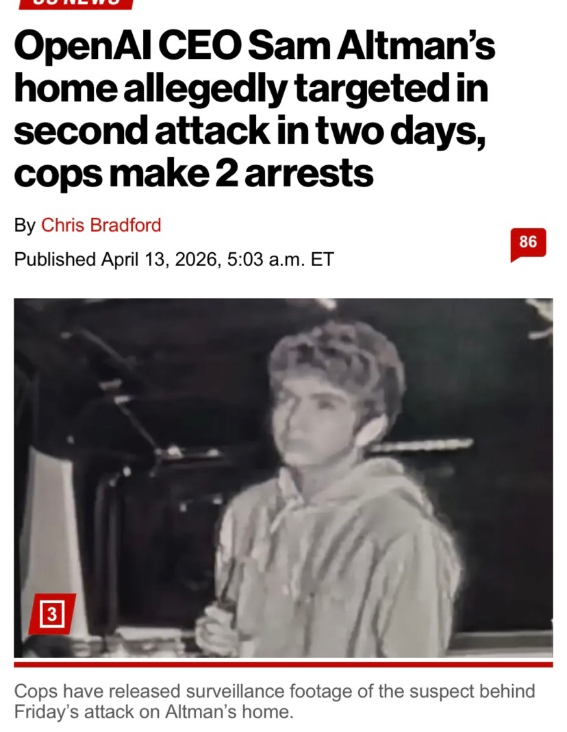 >Daniel Alejandro Moreno-Gama, 20, was arrested Friday after allegedly throwing a Molotov cocktail at Altman’s home. >He has been hit with a slew of charges, including attempted murder and arson.>Moreno-Gama, from Texas, was also accused of possessing an incendiary device and possessing a destructive device, KNTV reported.>He allegedly threw the Molotov cocktail at the exterior gate of Altman’s home, which caused a fire.https://nypost.com/2026/04/13/us-news/openai-ceo-sam-altmans-home-allegedly-targeted-in-second-attack-in-two-days-cops-make-2-arrests/