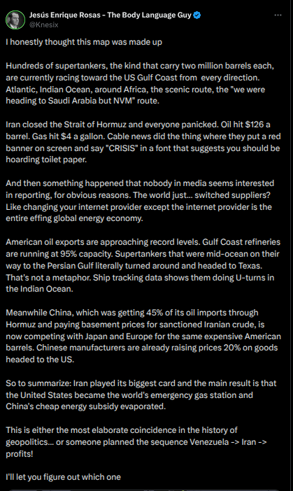 People are only just catching up to Trump's 200IQ yet again. The dude is a mastermind, people are so quick to so easily get mindbroken. He wrapped up Venezuela and immediately went to Iran, why? He WANTS to close the Straight of Hormuz. They don't want Iranian oil flowing AT ALL. They however couldn't just turn the tap off they needed to go over their and cause a mess. This is Mafia shit 101, you setup a new shop and you immediately go to your competitor in town and start causing trouble, smashing up windows poppin' guys in the mouth till no one wants to go there anymore. The US is ensuring everyone is going to get their oil needs from Venezuela.This is why the leadership in Venezuela turned over so easily: They got an incredible economic deal. South America will become the new Qatar, Dubai etc. The mid east will dry the fuck up. You'll see the Saudi's start being pissy soon when they realize what is happening.