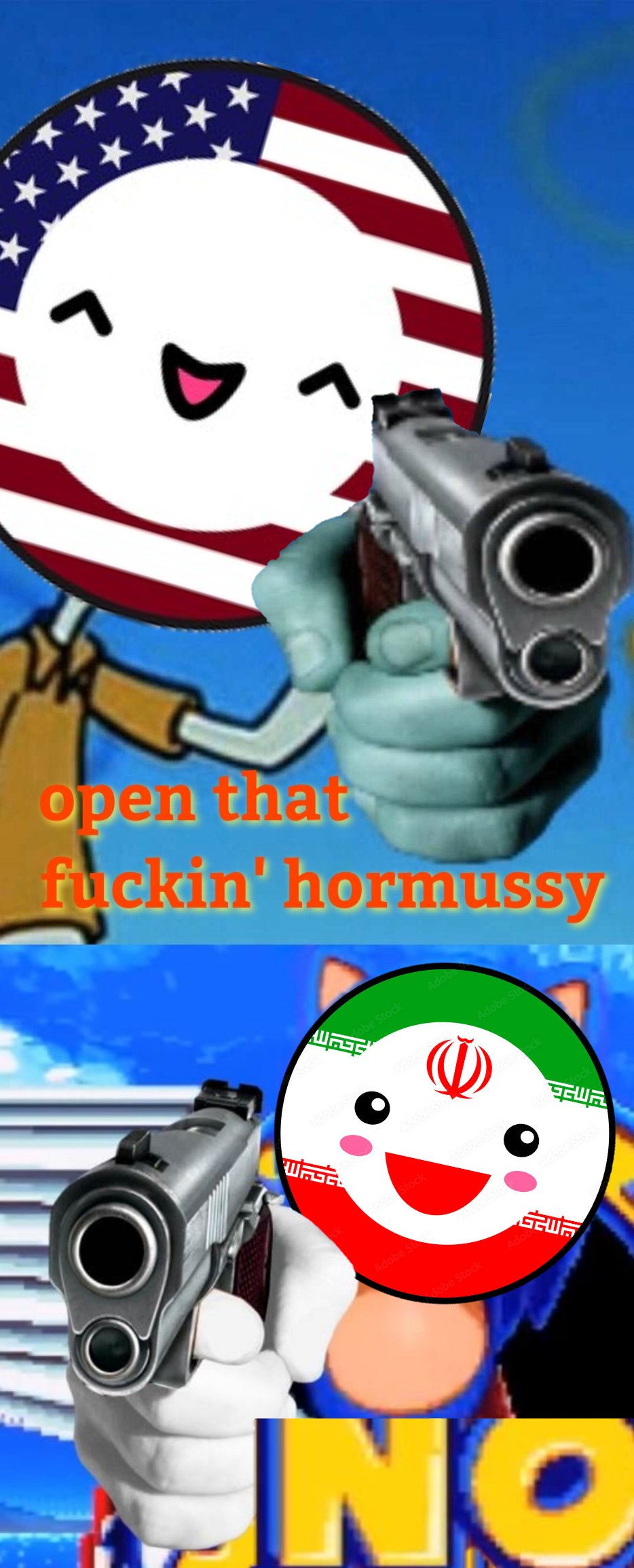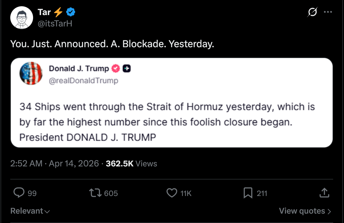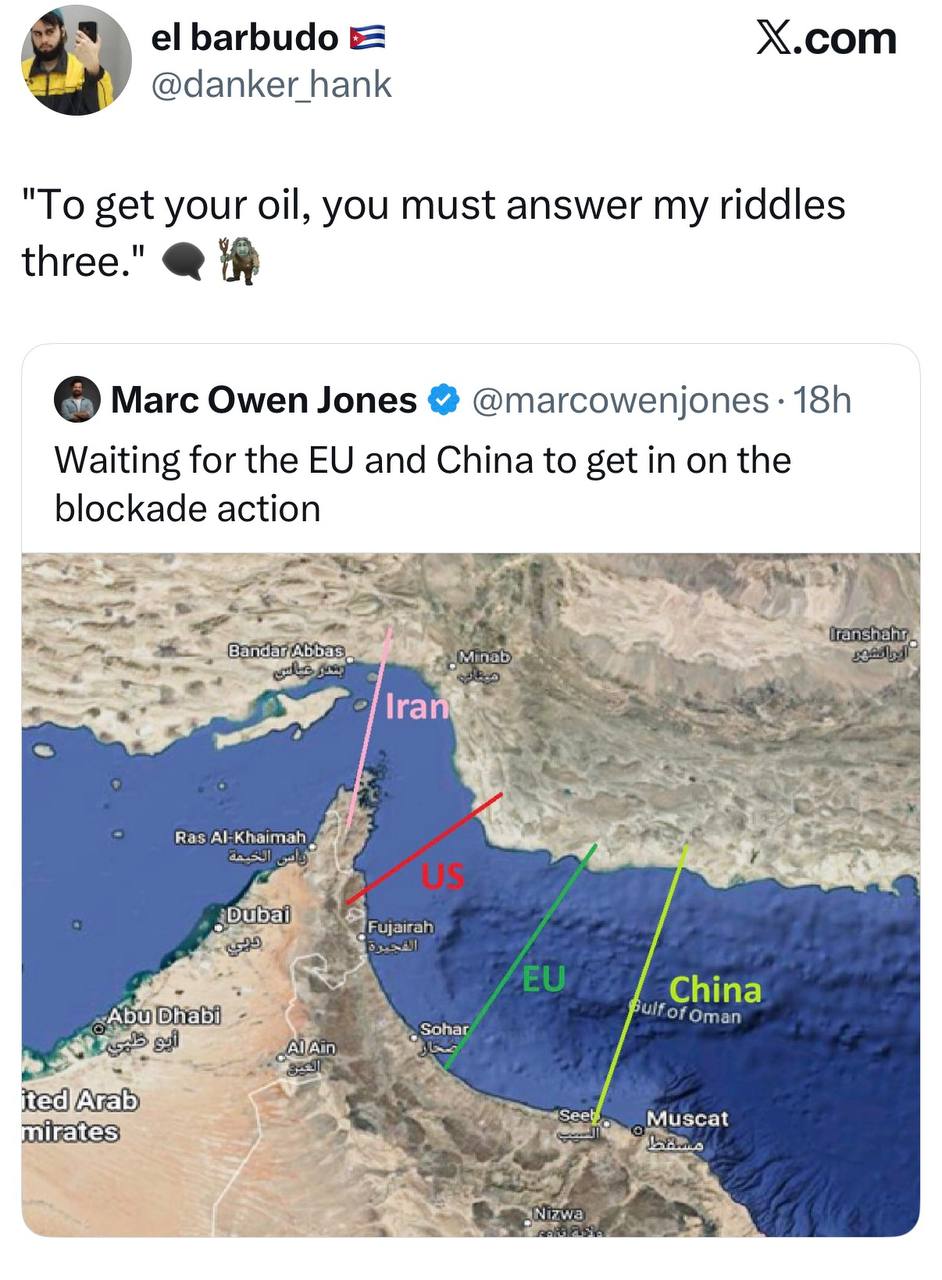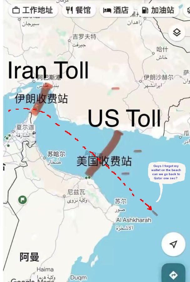 >its not a war>actually...we won the war>but we need your help Europe!Iran; No, we won the war>No, I said I won!Then why is the strait closed?>OPEN IT RIGHT NOW YOU FUCKERNo>Ok we dont actually need it, we sell oil lmao, we dont buy oilOk>open the fucking strait right now!Sorry Its blocked>You cant block the strait, IM BLOCKING THE STRAITIts almost a looney tunes episode or 3 stooges shit.