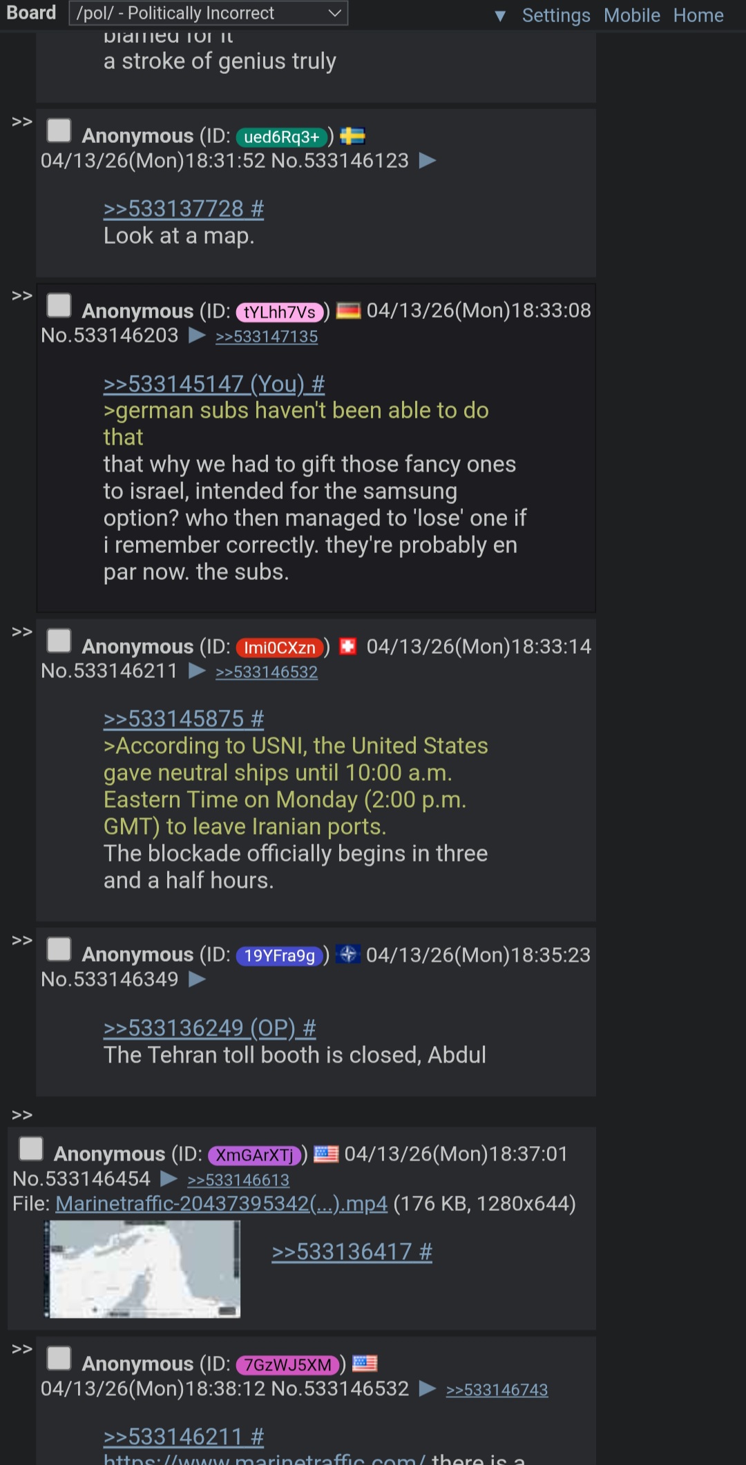 >>533138946>The strait didn't appear this year and it isn't an internal Iranian waterway. Their word doesn't dictate world affairs.They closed it and enforced its closure at gunpoint. Their word absolutely does dictate world affairs, since they've effectively forced USA into blockading the rest of the world in a desperate bid to save petrodollar. The strait is theirs until other arab nations get their shit together to either claim it or force it into neutrality again.>but the us blockadewill stop the moment chinese ships attempt crossing