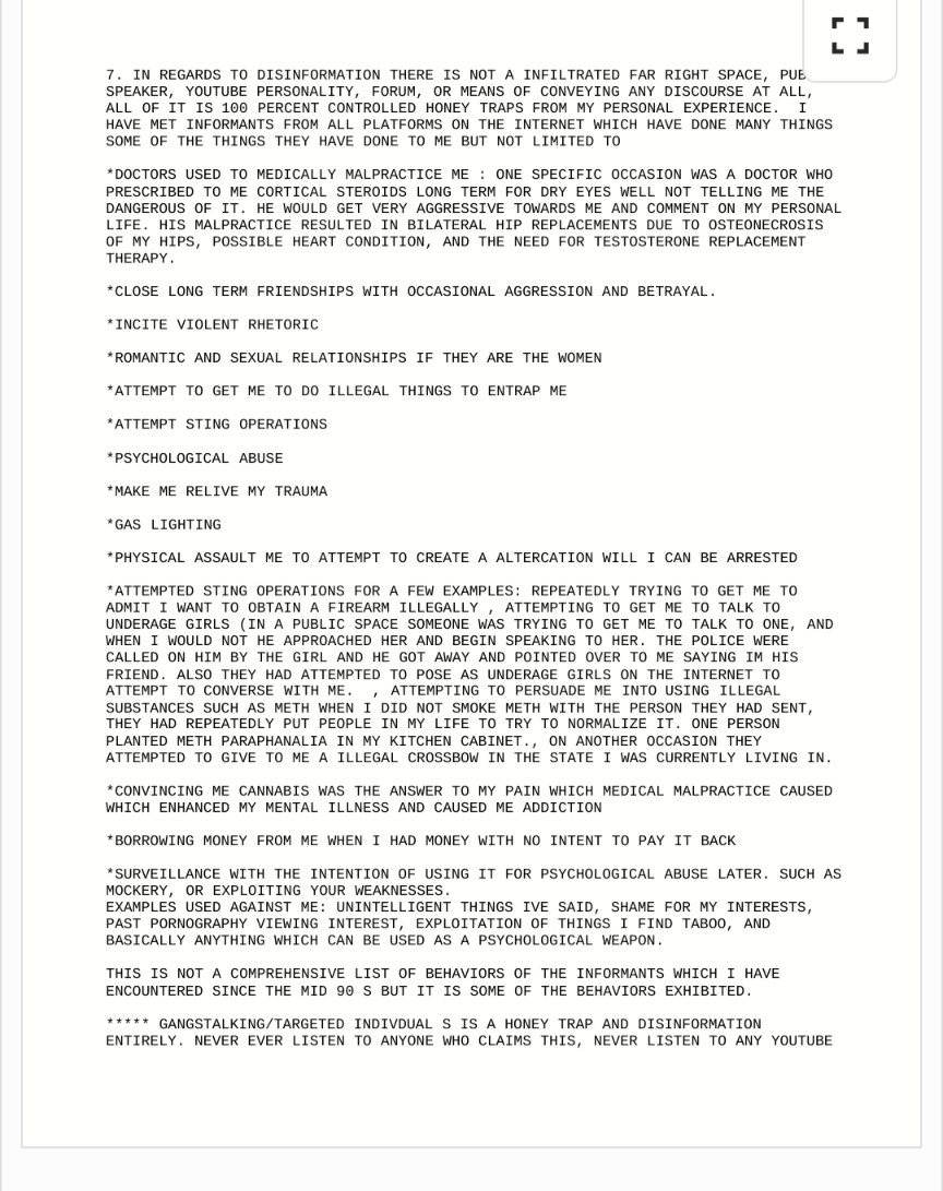 complex ptsd behaviors are quite similar to schizophrenia. I dont deny having a mental health struggle, but what Ive written in this document is confirmed lived testament to my struggle well retaining my core beliefs and the punishment I was rewarded. Instead of skimming what I have written and criticizing me, you can live in your false reality believing in what you want. My entire point was that there are people on the far right who have been tortured, and the state sponsors misinformation and dissent controlling the entire narrative. People who have responded in vulgar or dismissive manner towards me either are state actors or simply have not looked into the matters discussed in my document. I am of clearest mind I have been in a long time, and hold true to these statements. Research information warfare and the subjects ive discussed.