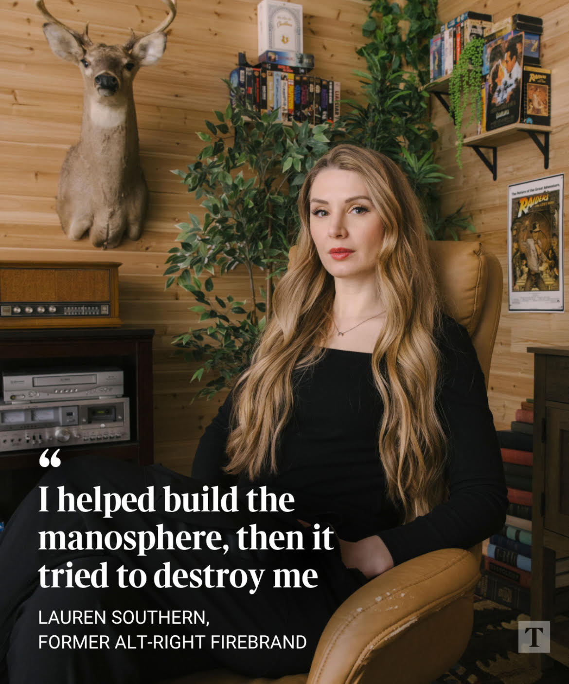 Looks like she's trying a multigrift.She's combining the "conservative", cabin aesthetic of conservatives like Tucker Carlson and Matt Wals -- as well as many zionist youtubers (with the deer head), and the gen-X / 1980s aesthetic, with the VHS tapes.