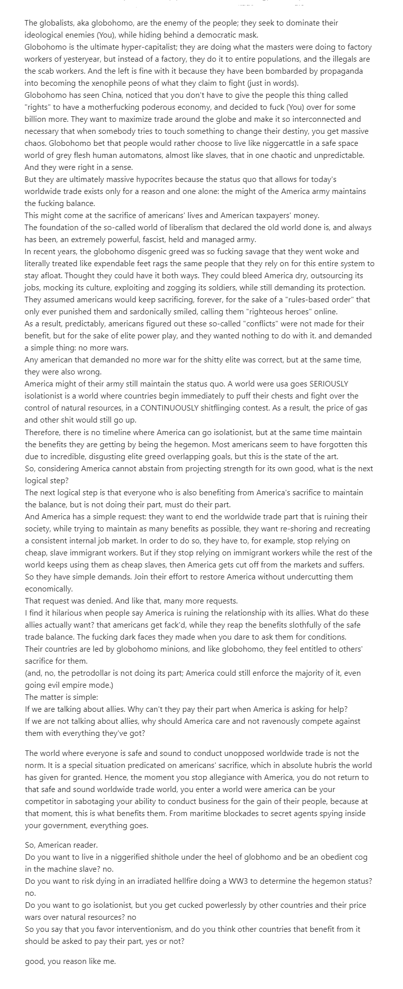 Watching shills tell obvious lies hoping and praying someone more uninformed than they are will buy it will never not be hilarious. Their entire world view, their very existence, is predicated upon the propagation of pure lies and blatantly manipulated half truths. Not even the most brainwashed discord tranny could ever convince themselves that theyre the "good guys" when every word they say is knowingly in service to falsehood.