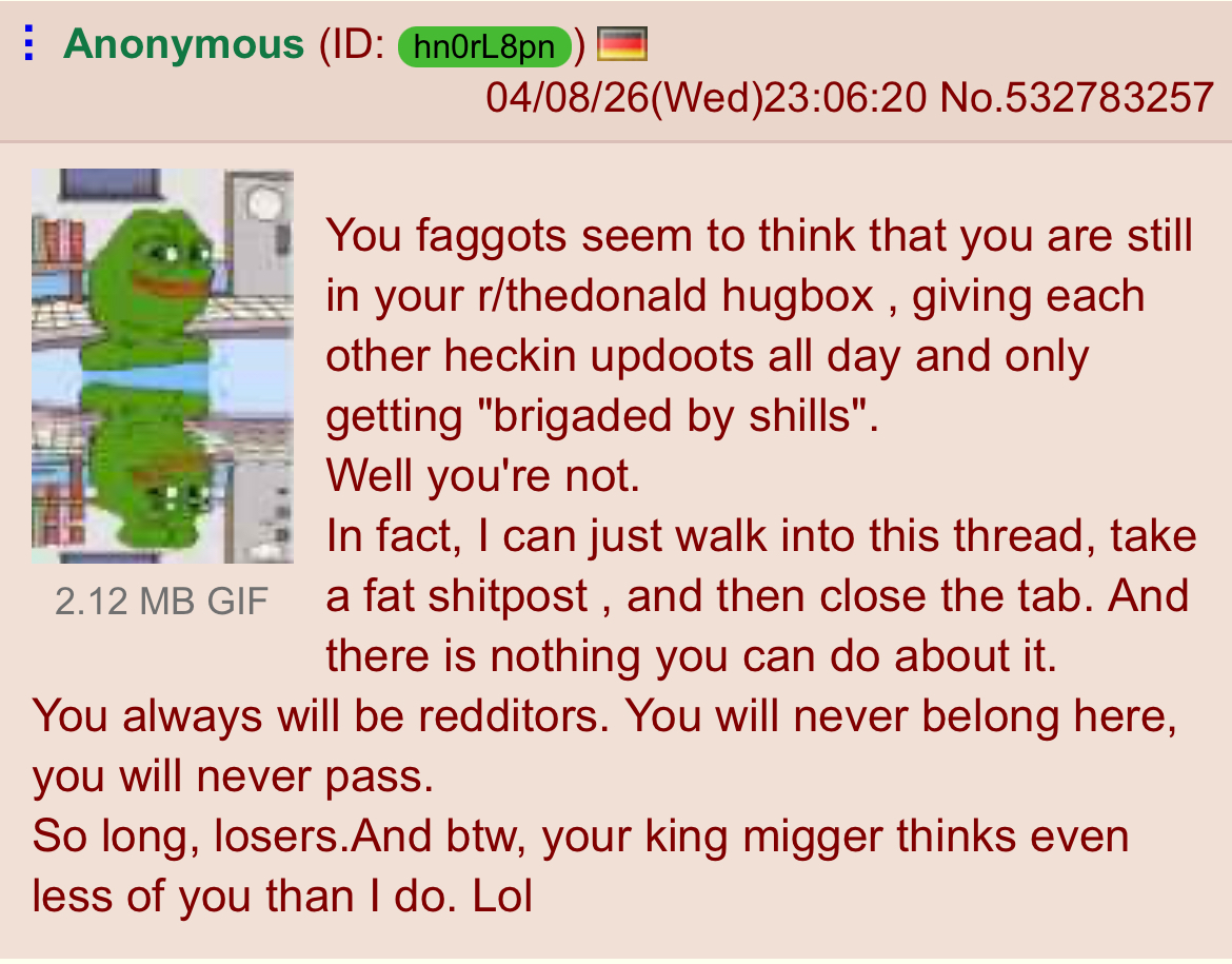 I could watch that tranny last thread wilting in real time. Hes one good push from the Final Meltdown. Faggot was ragetyping with tears in his eyes.