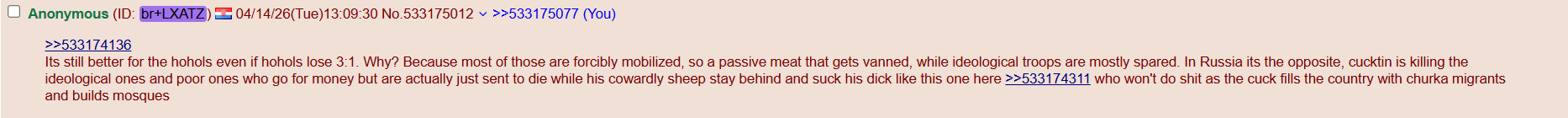 >>533174915 #They have been roughly at parity in terms of confirmed KIA and armor destroyed over last year. Ukraine can't spam glide bombs and has less arty, but (allegedly) deploys 30% more drones (and they have better connectivity due to Starlink and targeting due to CIA niggers feeding them data and planning attacks). Which leaves us at roughly parity in lethality. https://oboronka.mezha.ua/en/ukrajina-zastosovuye-na-30-bilshe-udarnih-droniv-310126/>>533175012 #You are right in the sense that Ukrainians dying does not hurt their puppeteers, while every Russian dying is a permanent loss for Russia. But that calculus only works if you admit that hohol lives are worthless.>>533175187 #That's completely arbitrary frame. Isn't getting 20% of your country seized and two main cities under siege by an army 3 times smaller than your own the biggest L imaginable? Ukraine had completely overwhelming numerical superiority, yet managed to barely hold on. Talk about paper tigers huh.It's like if Belarus invaded Russia, Russia went into total war mode and barely managed to stop the invading army at Moscow while tanking significantly higher losses