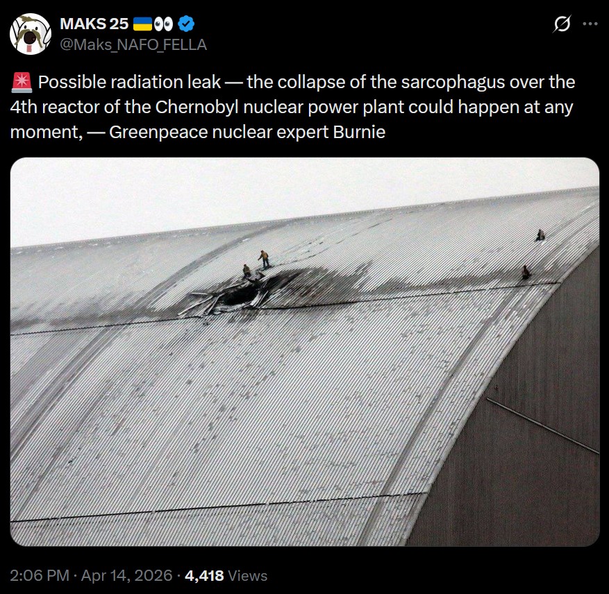 >Possible radiation leak — the collapse of the sarcophagus over the 4th reactor of the Chernobyl nuclear power plant could happen at any moment, — Greenpeace nuclear expert Burnie
