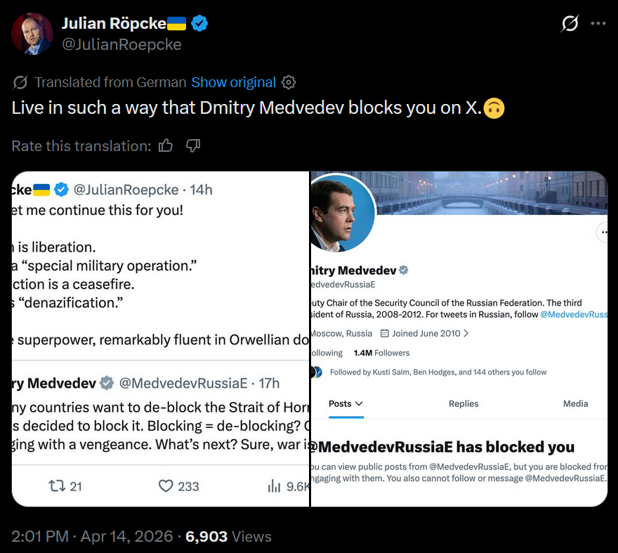 https://x.com/JulianRoepcke/status/2044008170482188300>Live in such a way that Dmitry Medvedev blocks you on X.blocked terror friend