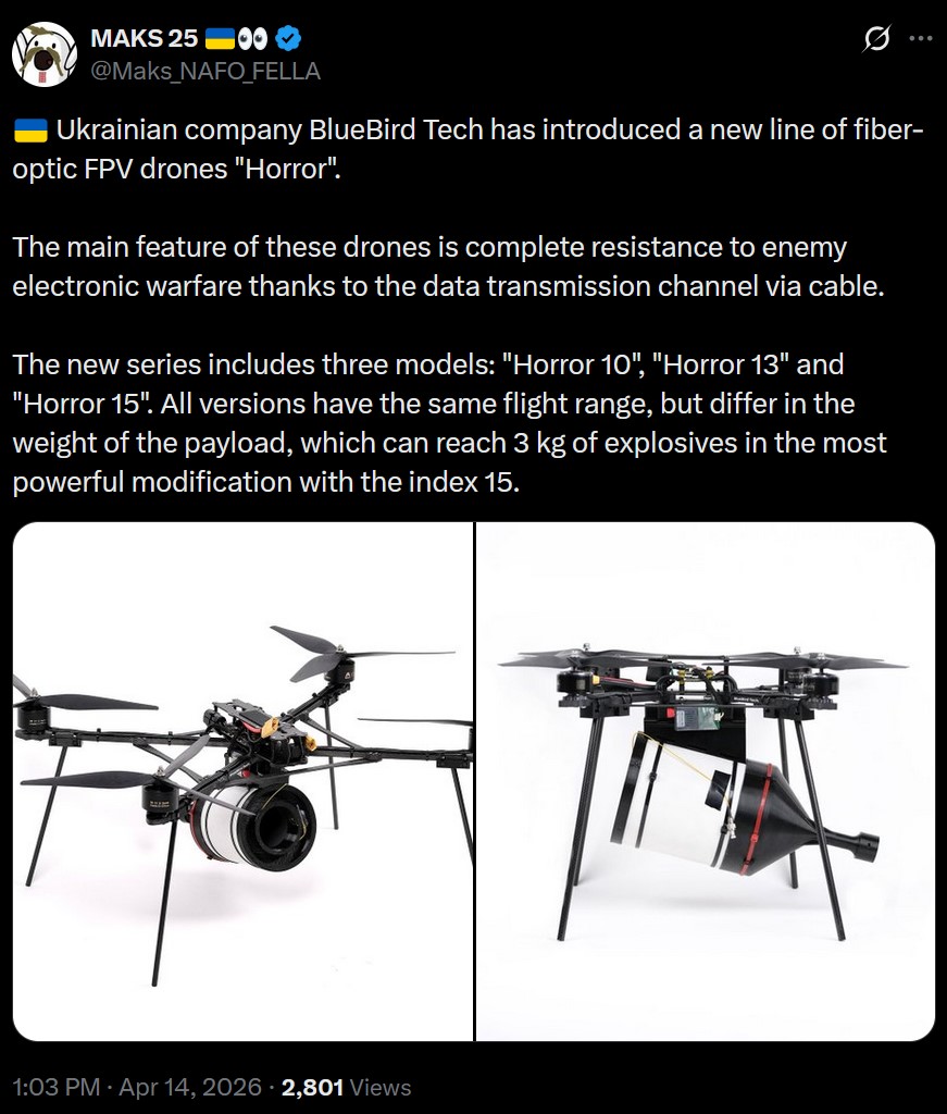 >>533181587LOLOLOLOLOLmeanwhile>Ukrainian company BlueBird Tech has introduced a new line of fiber-optic FPV drones "Horror". >The main feature of these drones is complete resistance to enemy electronic warfare thanks to the data transmission channel via cable.>The new series includes three models: "Horror 10", "Horror 13" and "Horror 15". All versions have the same flight range, but differ in the weight of the payload, which can reach 3 kg of explosives in the most powerful modification with the index 15.