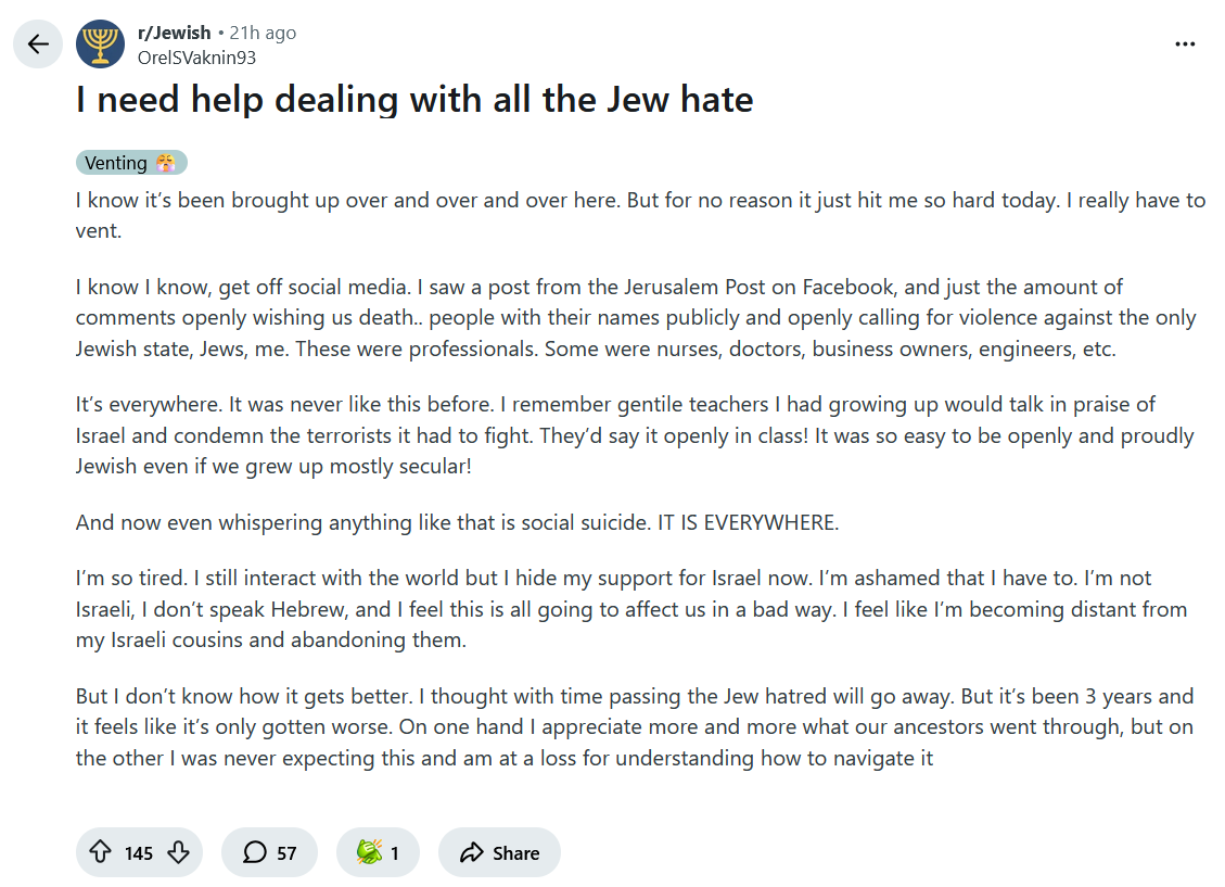 I once posted a thread on /r/Jewish asking them if they worried that the pager attacks in Lebanon were going to further worsen Jews' reputations outside of Israel. I also asked them if they believed the pager attacks were the right thing to do.They said that anything Jews do will make people dislike them, and they said that the civilian cost of the pager attacks was worth it. I believe these were all American Jews who responded to me.There is no saving some of these people. None of you will even have to lift a finger; they're doing it to themselves.