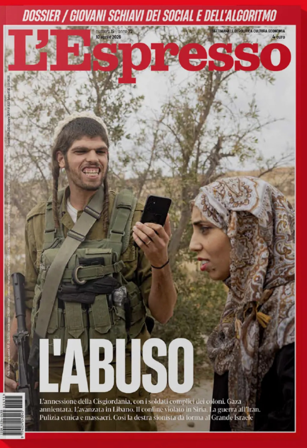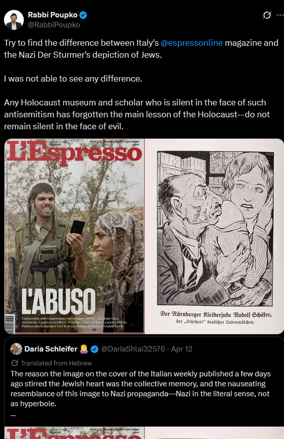 >The hallmark of Stürmer, the Nazi newspaper of violent anti-Jewish propaganda published in the 1930s, was to portray shaggy-nosed Jews intent on counting money or raping blonde women. The April 10 cover of the weekly magazine L'Espresso , long at the forefront of the delegitimization and dehumanization of the Jewish state of Israel, featured an equally eloquent image: a pale-skinned soldier with a machine gun in his hand, a Mephistophelian, ape-like grin on his face, facing a veiled, olive-skinned woman with her head bowed. The headline: "The Abuse." Below, in smaller type, a one-sided list of Israel's misdeeds: "The annexation of the West Bank, with soldiers complicit with the settlers. Gaza annihilated. The advance into Lebanon. The border breached in Syria. The war against Iran. Ethnic cleansing and massacres. This is how the Zionist right is shaping Greater Israel."