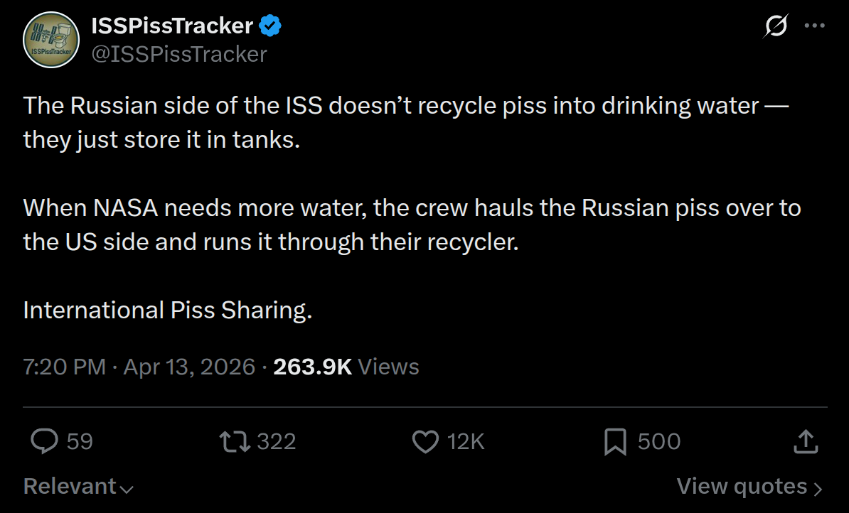Did you know that Americans in space have to drink Russian piss?