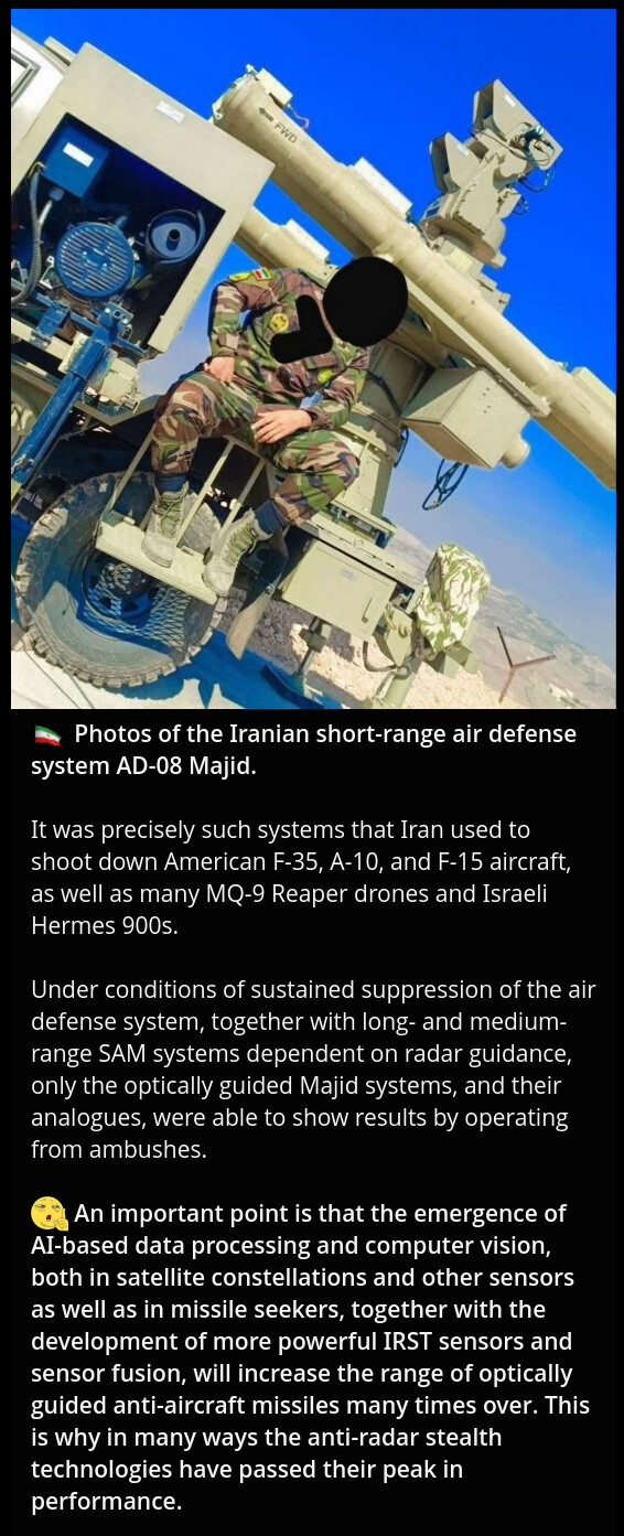 >>533185445>it might kill the AI bubble.it can be a convenient reason...no more no less>We can also expect Iran to spam drones & missilesCurb your optimism...its a healthy adviceBOTH sides got rekt >>533185550>seems specialized. usa specialized on killing radars so they do not use radars and usa cant do anything.6 km altitute is important hereIranians made "passive" missile that fit perfectly in this "sweatspot" 5-6km where pilots think "we are safe here" because they have only manpads left so they are free to bomb
