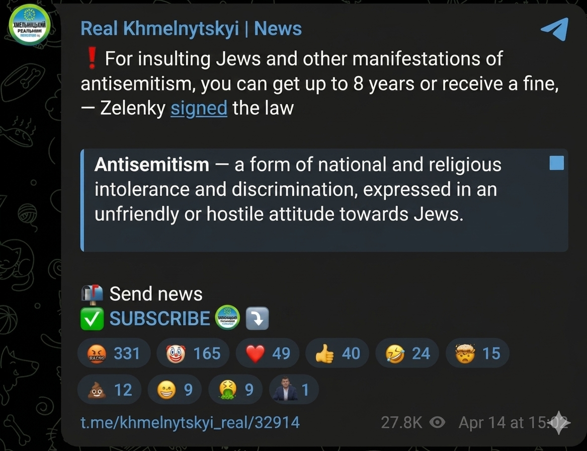 >>533186214>>Khmelnytskyi>IronicI don't get the irony. I see the irony in the fact that a kike signed a law in his favor. You wouldn't expect anything else, but it's so obvious and hilarious it could be printed on the front page of Der Stürmer.