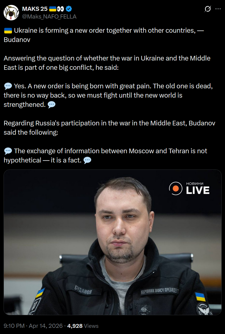 >Ukraine is forming a new order together with other countries, — Budanov>Answering the question of whether the war in Ukraine and the Middle East is part of one big conflict, he said: >Yes. A new order is being born with great pain. The old one is dead, there is no way back, so we must fight until the new world is strengthened. >Regarding Russia's participation in the war in the Middle East, Budanov said the following: >The exchange of information between Moscow and Tehran is not hypothetical — it is a fact.