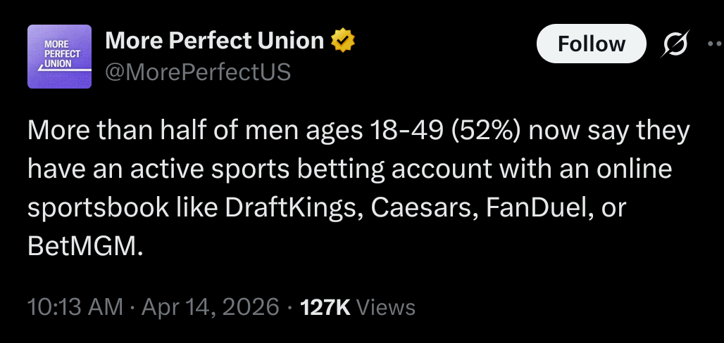 Gambling is destructive to society in a way drugs and alcohol cannot be. We need to restrict this shit to lotteries and bingos and whatever we let the Indians do on their plantations. An entire generation of men is being scammed out of their future