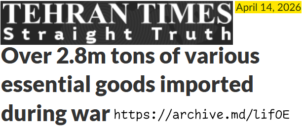 >>532752914TEHRAN TIMES: OVER 2.8M TONS OF VARIOUS ESSENTIAL GOODS IMPORTED DURING WAR> "Accordingly, customs clearance and the exit of more than 112,000 trucks carrying essential goods were carried out at the country's customs offices during the 39 days of the war, from February 28, 2026 to April 7, 2026.">In total, during the aforementioned period, 2,874,000 tons of essential goods were loaded and brought into the country through the national transport fleet.https://archive.md/lifOE
