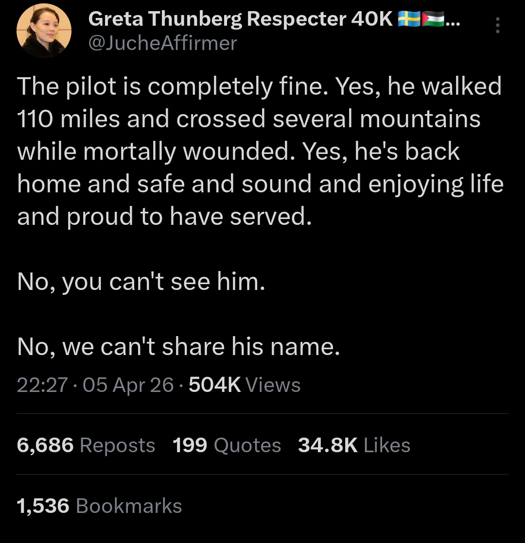 >>533191401>lots of copethe US will bomb the little that is left of IranandShips will pass through unimpeded the only thing that can stop it is if Iran bends the knee and agrees to every single term the US lays outwhich they won't because they're literal terrorists>>533191494more delusional conspiracy theory cope>pilot walked 110 milesyes, because the pilot ejected then parachuted down to exactly where the plane landedsee, this is the level of cope you have to buy into to believe this fake news