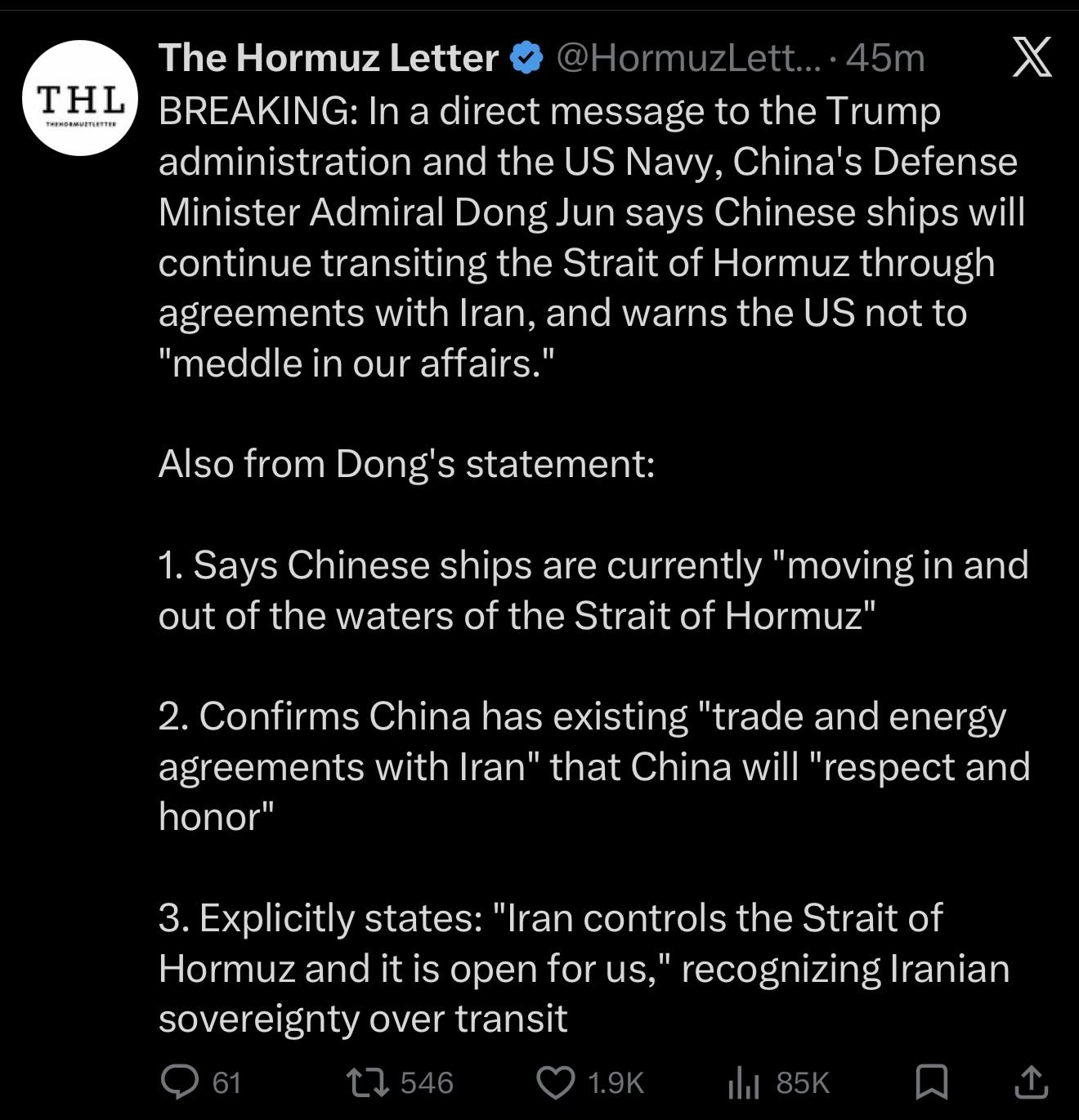 >>533190848Given the ship's current path it seems like it's going using the new shipping lane Iran created for inbound ships between Hormuz Island and Larak Island, do you think they will have to pay a second toll?