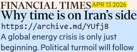 >>533191425WHY TIME IS ON IRAN'S SIDE>A global energy crisis is only just beginning. Political turmoil will follow> The longer the Strait of Hormuz is closed, the more the economic and political pressure on the US and its allies will mount. As a result, Iran’s negotiating hand is likely to be stronger — if and when peace talks resume.>The loss of some 20 per cent of the world’s energy supplies has already been called the “greatest global energy security threat in history” by Fatih Birol, the head of the International Energy Agency. >The economic impacts of the current war were cushioned for a while because a lot of oil and gas from the Gulf was already at sea when the US and Israel attacked Iran on February 28. But the effects of the strait’s closure — and of Iran’s attacks on Gulf energy infrastructure — are now really kicking in.>A rise in the price of petrol at the pump is just the beginning. A shortage of jet fuel will hit air travel, which will damage tourism just ahead of the crucial summer season in Europe. A lack of helium — much of which is produced in Qatar — could stop the production of semiconductors. Food production will be damaged by fertiliser shortages which will lead to further inflation.>The malign political and strategic effects of this war also extend well beyond the Middle East. Fuel price protests in Ireland almost brought the country to a halt last week, leading the government to call in the army to reopen highways and ports and to announce €505mn worth of fuel subsidies.worth the readhttps://archive.md/YUfj8