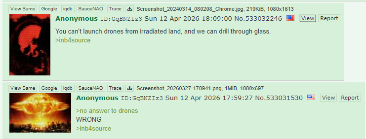 >>533194161>that Trump will use a tactical nuclear bombIt's been whispered before and talked out loud recently here and elsewhere, so i wouldn't be surprised really. A tacnuc isn't that big of a deal anyway, they can dial the yield to whatever they need to not cause excess damage and i'm assuming if one would be detonated, after such a long time, that it would be done in the absolute safest way possible, as stupid as that may sound. They would do an air blast or even a space blast, to keep the outfall to a minimum. If you really have be that guy that pops a nuke for military purposes (as opposed to shock/demoralization) the last thing you want to do is muck it up and completely fuck up 5 other countries or even more.Keep an eye on windy.com