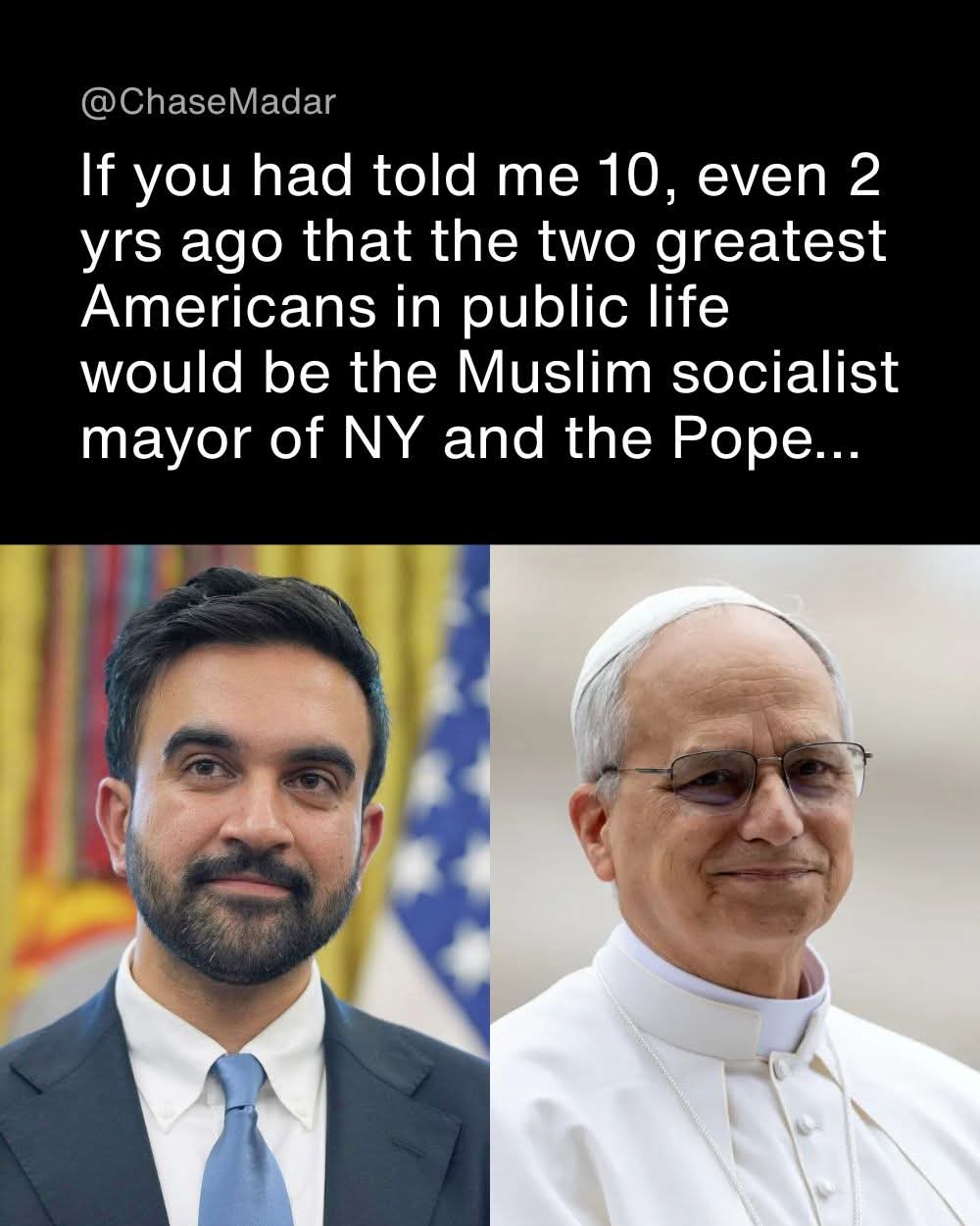 >>533206148Nobody mentioned Trump, of course…But calling a Muslim socialist NYC mayor and the Pope the 'two greatest Americans in public life' only makes sense if your entire metric is 'how much they hate Trump.' Without him they’d have zero meme and zero relevance. Peak TDS.