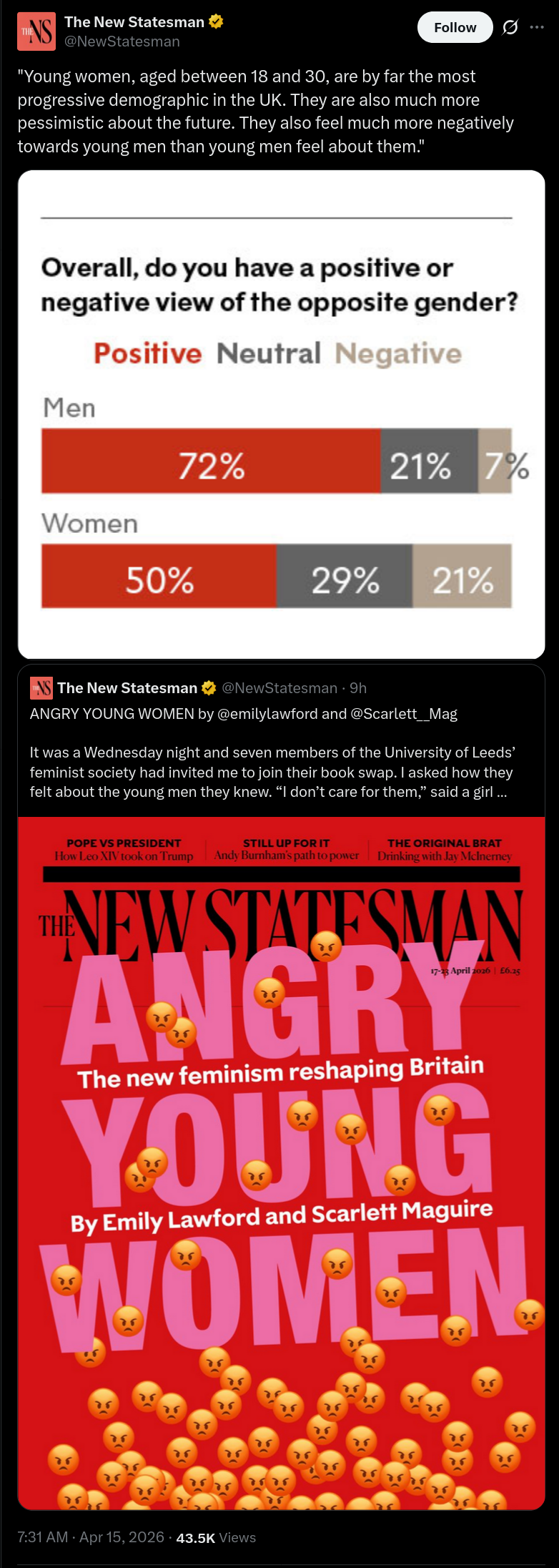 I was told that young men had become incredibly toxic and misogynistic.Turns out women are even worse.kekWhen women hate men it's wonderful. When men hate women OH NO WE'VE GOT A FAR-RIGHT NAZI CHUD PROBLEM QUICK CENSOR ALL SOCIAL MEDIA AND START THE STRUGGLE SESSIONS IN SCHOOLS.