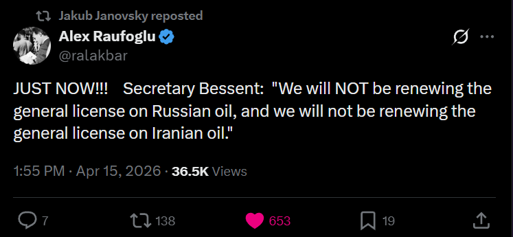 >tl,dr: Iran doesn't care about the blockade of its blockade. Now, more oil is offline from global supply. Seems like Iran believes time is on their side.>Iran Halts Petrochemical Exports to Prioritize Domestic Supply>Iran’s Petrochemical Industries Development Organization has ordered an immediate suspension of petrochemical exports to ensure domestic supply, citing war-related disruptions and price volatility, according to an official directive dated April 2026.>Authorities say the move is aimed at securing raw materials for local industries as shortages risk intensifies>Companies have been instructed to halt exports and redirect products to the domestic market>Firms must report cargoes that have not yet left the country for possible reallocation>The order reflects mounting internal pressure as war damage and external restrictions squeeze Iran’s energy sector.>Key facilities, including the Mahshahr Petrochemical Special Zone and South Pars plants, were struck in early April, sharply reducing output>A U.S. naval blockade on ships entering or leaving Iranian ports has also paralyzed maritime tradehttps://xcancel.com/DropSiteNews/status/2044525197751980141