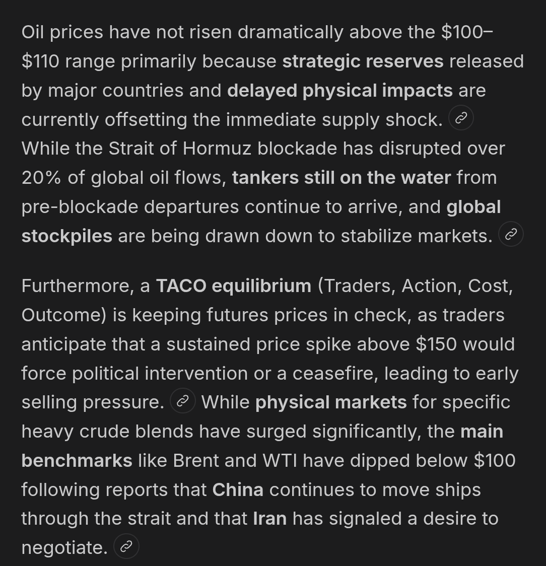 >>533230928It's a paper market, not optimism. People are trading on oil futures as apposed to the actual price. You could call that optimism but it's more like something they were told to do by the white house either being assured the market would bend to the low prices or they are purposefully taking the loss to try and "pressure" Iran to make them think we don't need the strait. But you can look up the actual price of oil any time. And it is continuously climbing. What's eventually going to happen is that these people buying oil with low prices are going to have their tankers arrive and be expected to actually pay the real price. When that happens not only will the market take a big hit but so will these people buying oil, they will lose a lot of money. And the ones not willing to pay the real price will walk away, making the people selling that oil leave with a loss. It's actually making an already bad situation much worse. It's a huge gamble and it's going to make Trump want to wrap this shit up by the end of the month so who knows what he'll try.