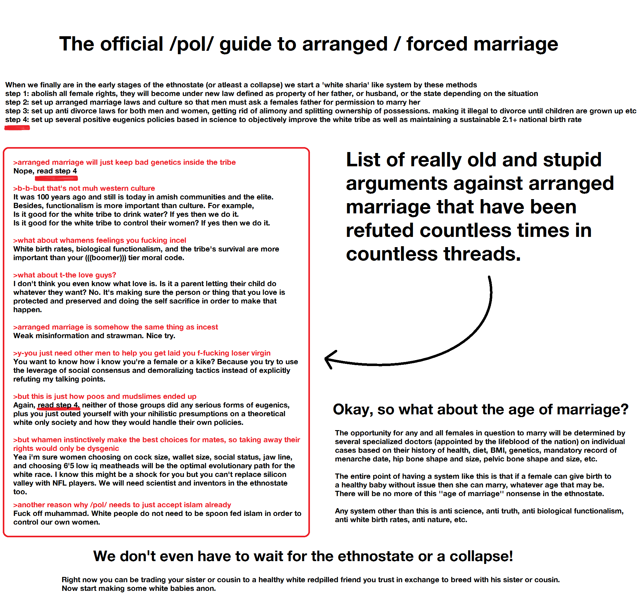 >>533231364>the political views of a simp who puts pussy on a pedestalmarriage was invented by the state. what do you do with an utterly useless, hideous, can't work, can't fight, unfuckable hag? and let's not forget even the most beautiful woman eventually walls and has a good 60 - 70 years of being an unfuckable hag. the answer is you trade her fuckable years to men who in return carry her after the wall. unburdened by the woman questions states were able to focus on higher priorities like fighting wars and building civilizations and shit.