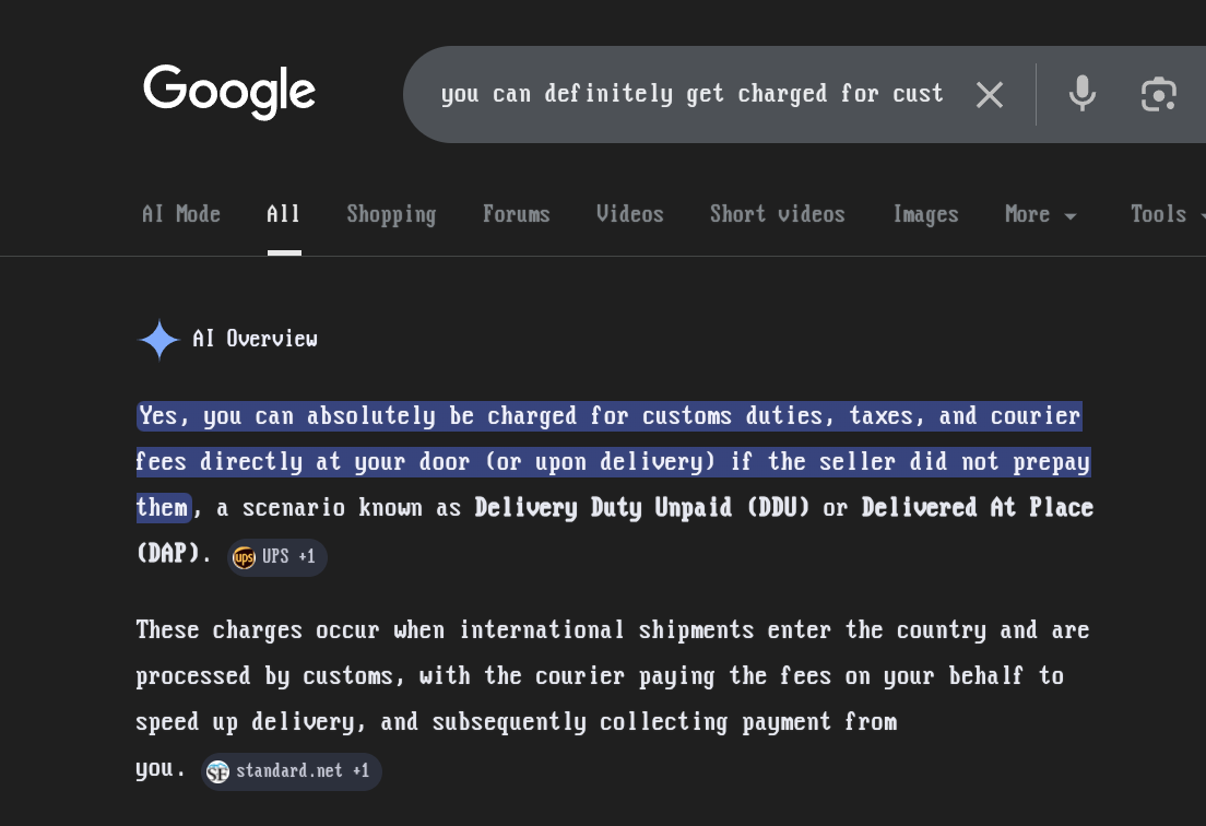 >>533267130>>533267169>>533267356>>533267423>>533268138>>533267954>you can definitely get charged for customs paid at your door retardhttps://www.ups.com/us/en/support/international-tools-resources/understanding-customs