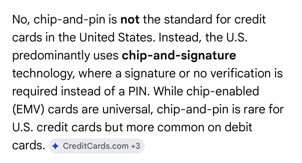 >>533268114Chip-and-pin is different than chip-and-sign. While we do have the option of getting chip and pin cards in the US, you have to specifically ask the bank for them. Different pin than a debit card.