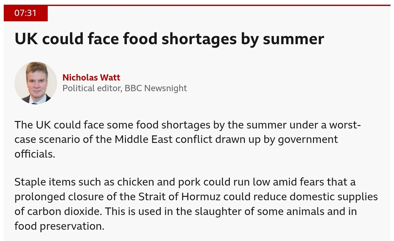 https://archive.ph/AxLxK>Britain preparing for food shortages as Iran war bites>Secret government analysis sets out ‘worst-case scenario’ whereby a lack of critical carbon dioxide supplies would hit farming and the hospitality sector>Britain could face shortages of chicken, pork and other supermarket goods this summer if the war in Iran continues, a secret government analysis has found.>Breweries would also be hit because the gas is used to make drinks fizzy. Concerns were raised about the shortages coinciding with the Fifa World Cup, which begins on June 11.It's over>To militate against the scenario, plans have been drawn up to ask factories to increase CO2 production to 100 per cent by ceasing other manufacturing. Emergency legislation has been discussed to compel the factories to co-operate, which could be passed in only a few days in parliamentary time.>Competition law may also be relaxed to allow prioritisation of more limited CO2 supplies to key areas, including healthcare, as part of the preparations.>The Civil Contingencies Act, which gives ministers temporary but far-reaching powers to respond to national emergencies, could be invoked instead. Government lawyers have been told to prepare advice on activating the legislation.>Plans were also discussed for compensation to be paid to suppliers for ceasing production of their main products to focus on CO2. Officials estimated that the move would cost tens of millions of pounds.Further sliding into a command economy as we add to Reeves' gaping hole