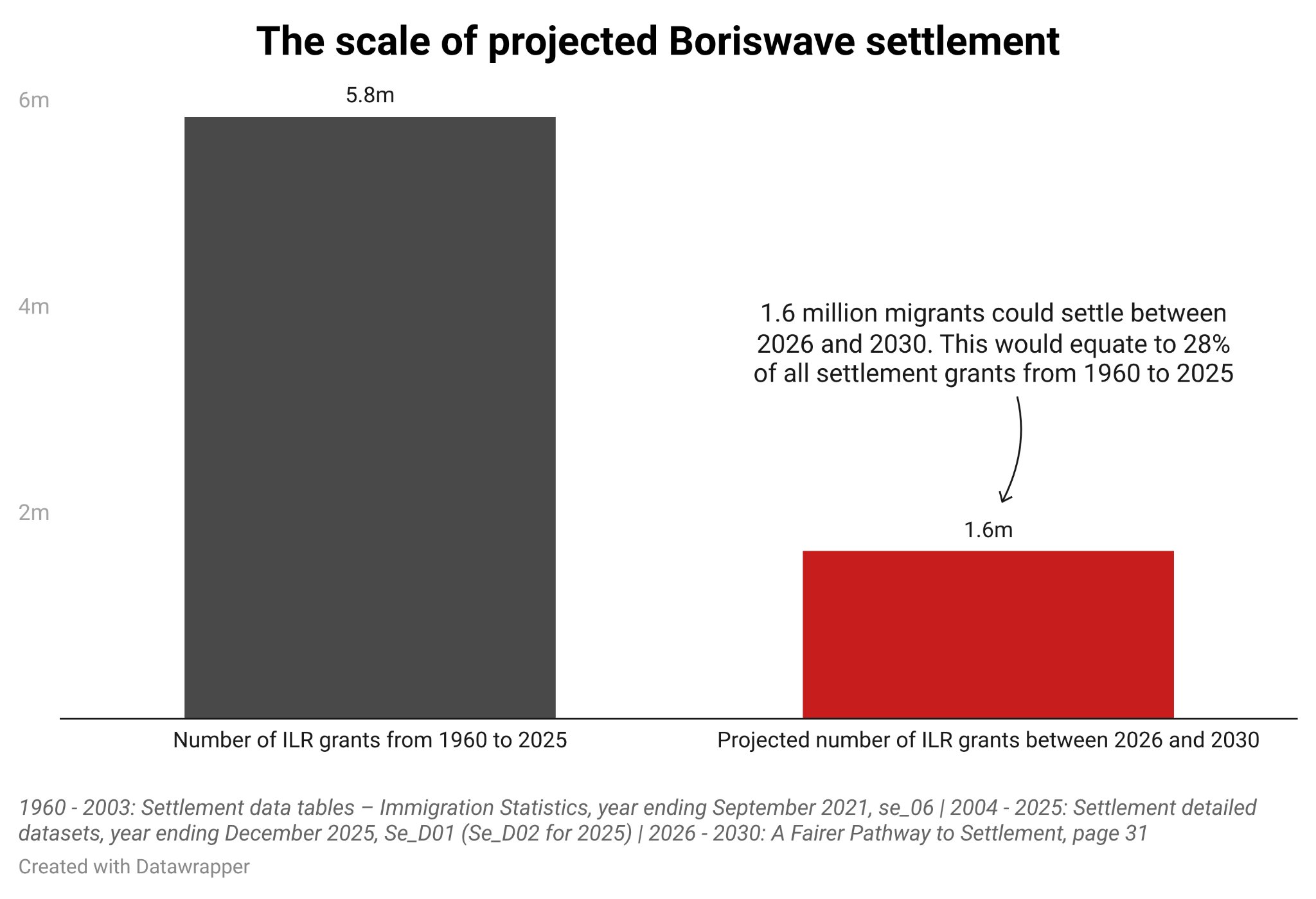 >I don't think many people truly appreciate the scale of the Boriswave.>From 1960 to 2025, a 65 year period, the Home Office issued just north of 5.8 million settlement (ILR) grants.>According to the Home Office's central estimate, between 2026 and 2030, 1.6 million Boriswave migrants will be granted ILR. In the high estimate, this increases to 2.2 million.>The central case would represent 28% of ILR grants from 1960 to 2025 being issued in just 4 years. The high case would represent 37% of ILR grants from 1960 to 2025 being issued in just 4 years; nearly 40%.>The scale is insane.