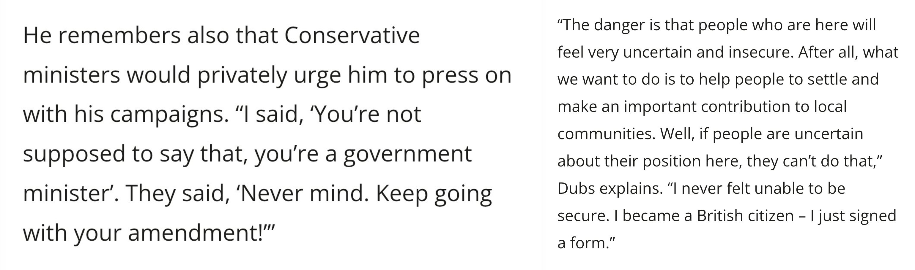 >>533243880>If the Labour peer had his way, it would not only be Mahmood’s immigration rule changes under threat. He also wants her to end the citizen-stripping that has left Shamima Begum – notorious ISIS bride or grooming victim, depending on your view – stateless.>“Now she’s stuck, having lost three children, and we’ve taken away her citizenship, and the Bangladeshis won’t accept her. We have enough self-confidence as a country to say that one woman, who’s now 26, can come back here – and if she’s committed criminal offences, then she comes before the British courts. But we can’t say indefinitely, ‘You’ve got to stay there forever.’ It’s intolerable,” Dubbbbbs fumes.A self confident country would have simply killed her with a drone strike over a decade ago. Plus she wanted to go and live there forever, that's on her, not to mention her family moved bak to Bangladesh. >“The court only said the home secretary had the right to take away citizenship. It didn’t say that on the merits there was any just justification for it. What absolute pilpul, a difference without distinction >Dubbbbs is unambiguous, however, in his opposition to Brexit. “Brexit was a disaster for this country. An absolute disaster,” he says. “We were sold it on false promises.” He points to the “complete lie” that “80 million Turks were poised to enter Britain”.But they were?>“I probably knocked on as many doors doing the campaign as anybody you’ve talked to, and on the doorstep, they saw our leaving the EU as a way of dealing with immigrants… And it was a lie.”Only because of the post Covid wave which was replicated among numerous other countries >>533244016yeah lol