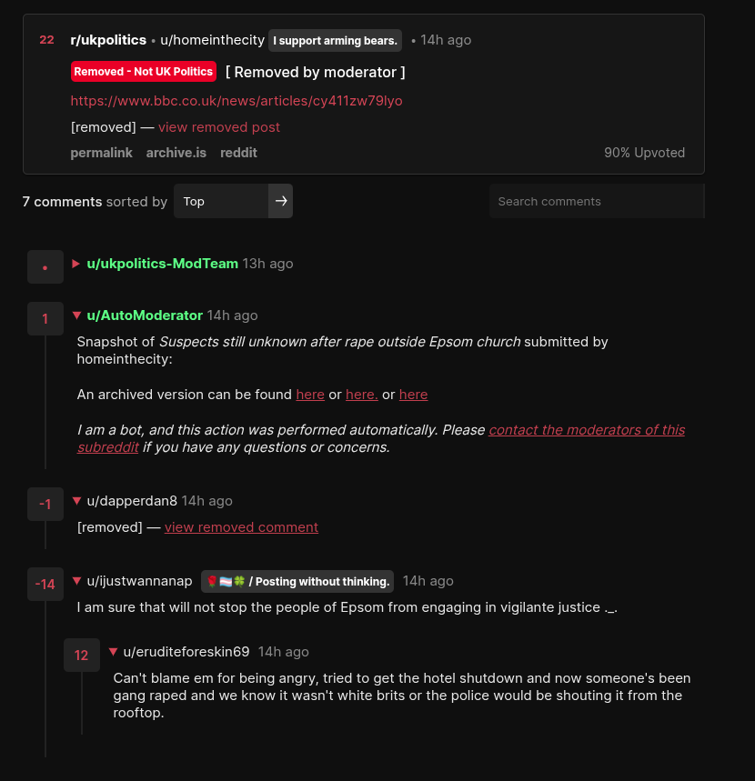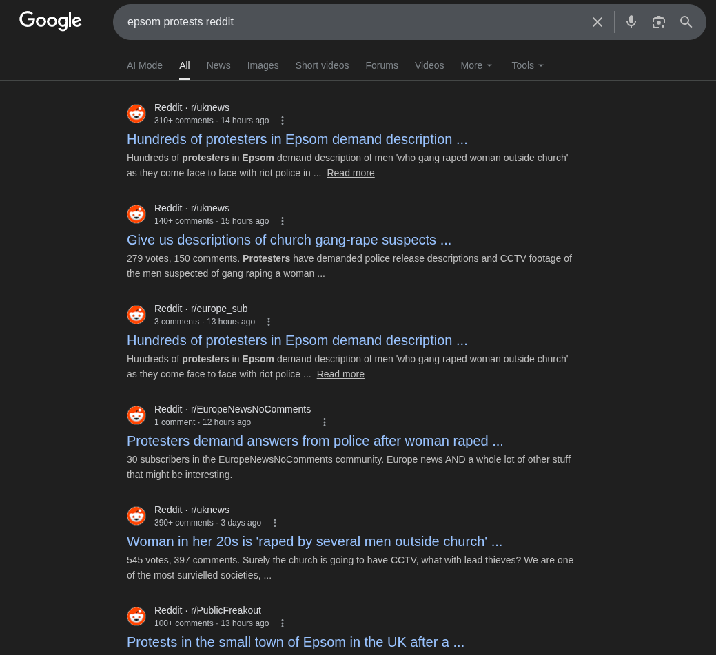 Funny that if you search for 'epsom protests reddit', there's no threads on the major uk subs.Just one thread in 'uknews':https://redlib.catsarch.com/r/uknews/comments/1smi8l9/hundreds_of_protesters_in_epsom_demand/And here's the OP:>.. [ Removed by moderator ]>https://www.dailymail.co.uk/news/article-15736617/Hundreds-protesters-Epsom-demand-description-men-raped-woman-church-riot-police-street.html>[removed] — view removed postThe UK's actually pulling in some dark arts here.
