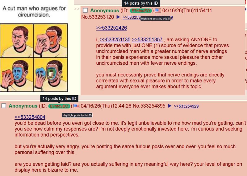 >>533255944>how can you say this and not realize your spot is dried and shriveled?because we can measure it easily and have already tested and confirmed it. you aren't stroking your foreskin, bro. i already know this. you all know this.>>533255948even if all of the premises in that post were accurate (and they aren't), i can think of so many more evil things right off the top of my head. that post is just hysteria bait.>>533256117the advancement of medicine enables many operations on the human body that were extremely risky or impossible in the past. it's got nothing to do with justification.>a body part needed to have the most intimate connection to another human beingcome on, man, it's just your foreskin. like i said to the other guy--we all know you're not stroking your foreskin when you jack off. everyone on 4chan has seen at least a few videos of both cut and uncut dudes masturbating, whether we wanted to or not.>>533256212i am allowed to disagree with you on the internet without being upset. it's a common phenomenon actually. not everyone who disagrees with you about controversial topics is deeply emotionally invested in them the way you are.