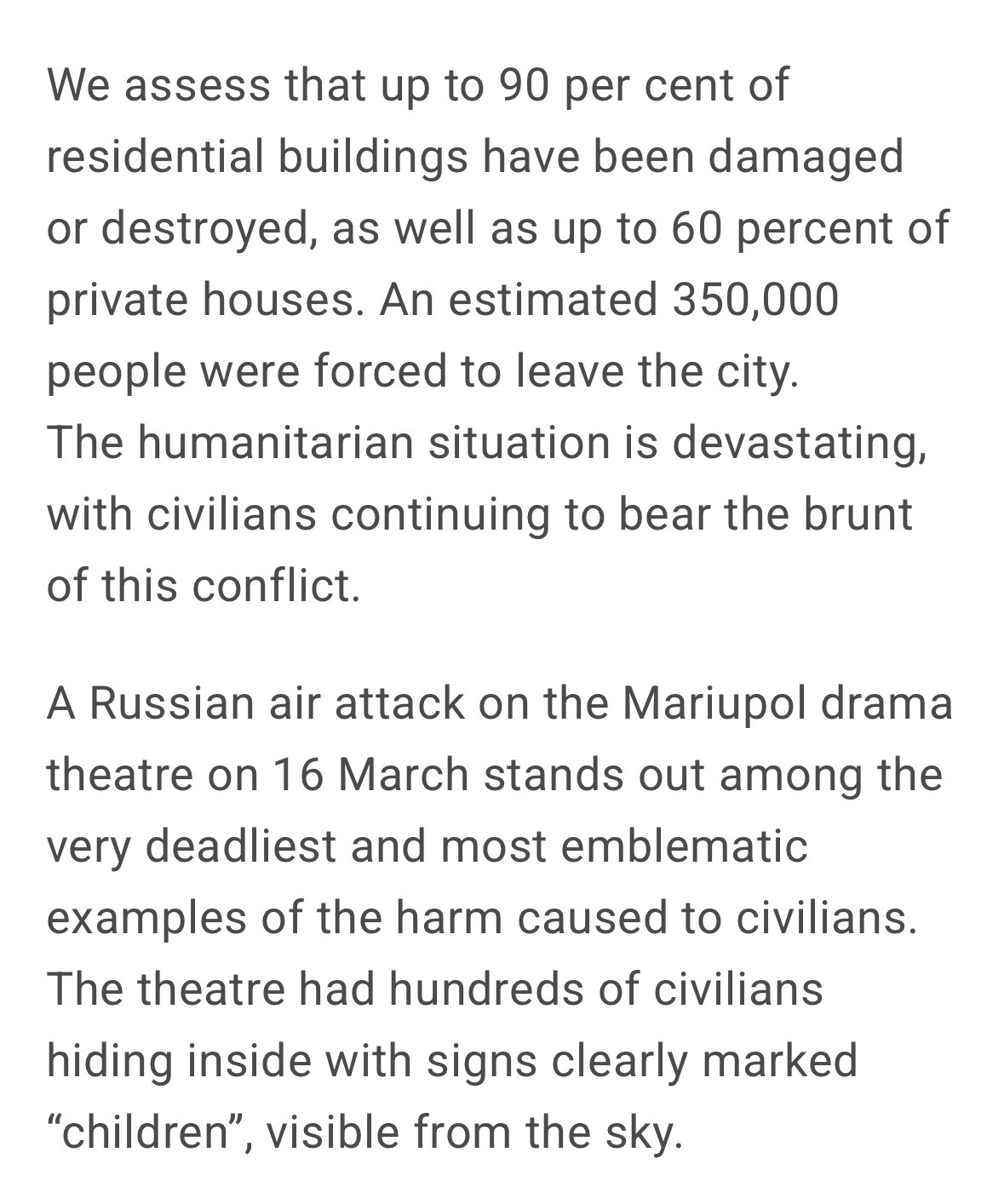 >>533255100>only committing these mass civilian massacres in buchapidrila, over 20,000 civilians were murdered by russia in Mariupol alone, due to the russian indiscriminate bombings and refusal to allow civilians leave town - "because some Azov soldiers might slip away among the civilians". "Human Rights Watch documented that at least 8,000–10,000+ people died during the siege, based on analysis of mass graves and satellite imagery."https://www.ohchr.org/en/statements-and-speeches/2022/06/high-commissioner-updates-human-rights-council-mariupol-ukraine