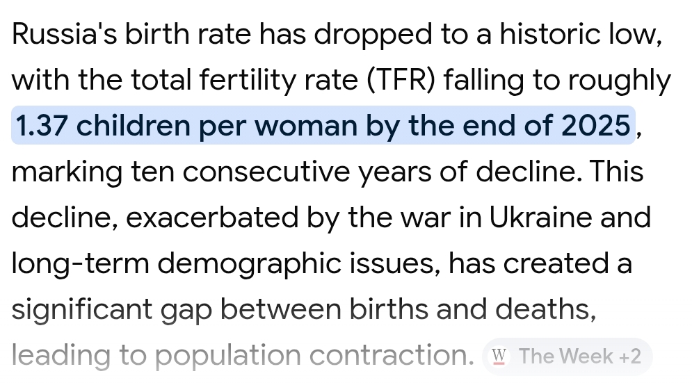 >>533247091It's kinda pointless bringing it up when Russia also has a low birthrate of 1.37 and is in it's 10th consecutive year of decline.