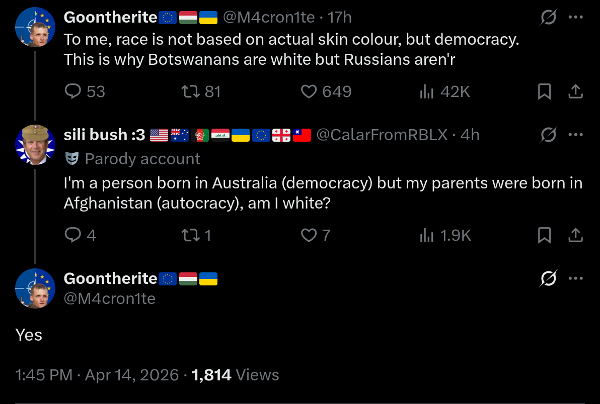 >>533253196>This with a sprinkle of fatalism, things are because they are and we have a perfect recipe to install a puppet regime like in EU statelets and pretend it's a victory because you chose puppets every 4 years.Not all polities are alike anon. For example, if a politician tried to argue that low-skill immigration should be allowed, they'd be expelled from their party which would immediately denounce them and that party would still suffer in the polls.